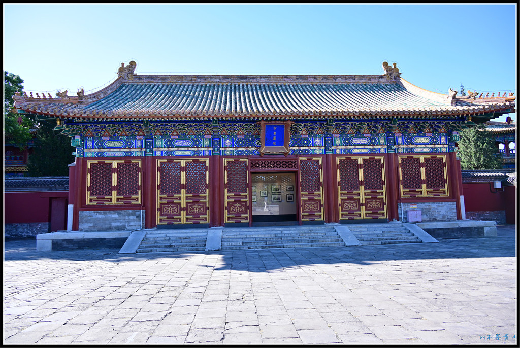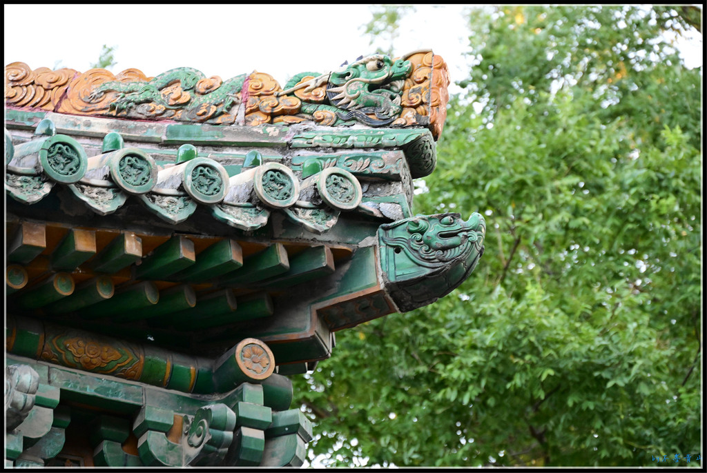 楠木殿的东、西配楼各五间,歇山顶大脊,绿琉璃瓦顶,与大殿檐角相对。