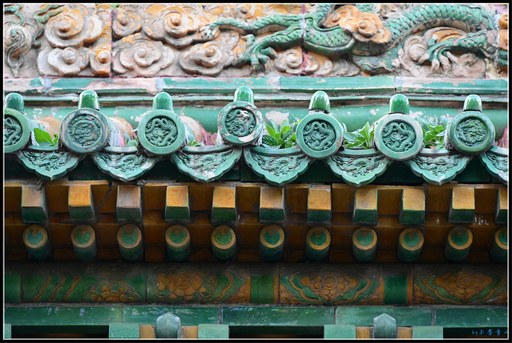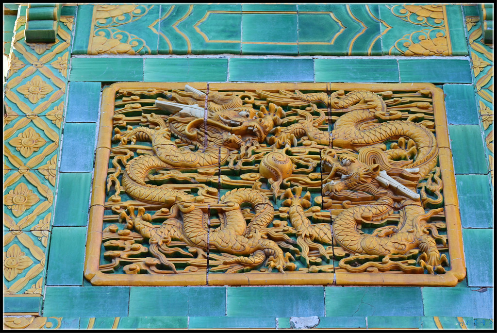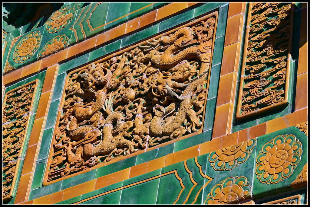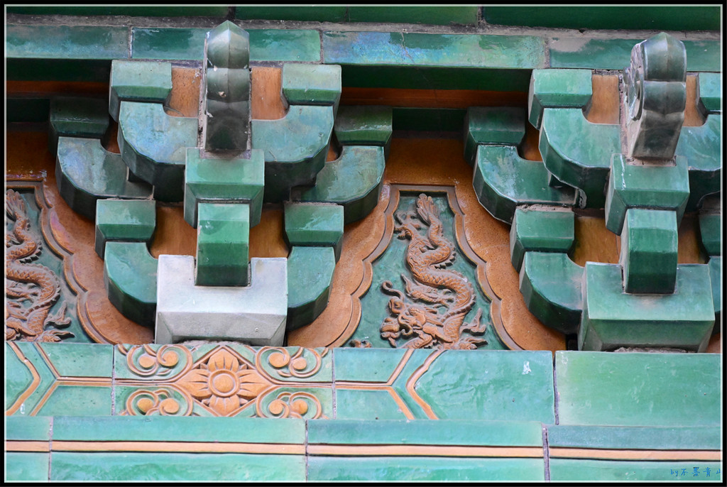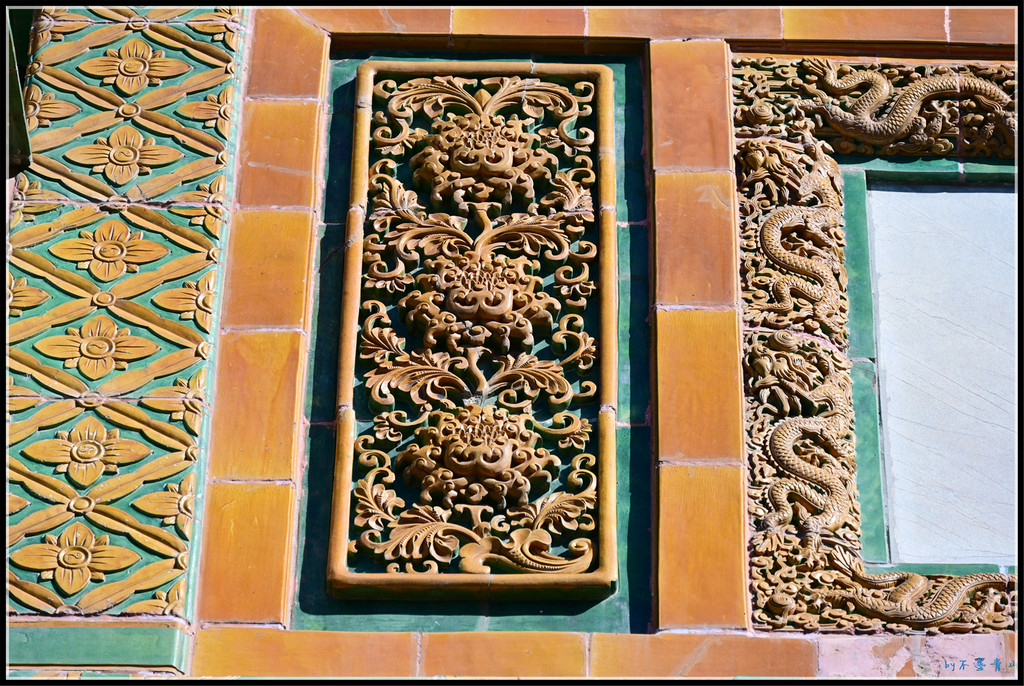 门之间的琉璃墙上琉璃龙雕做工精湛细腻。