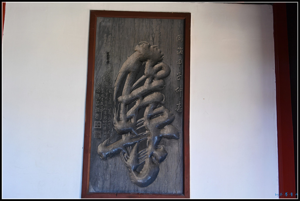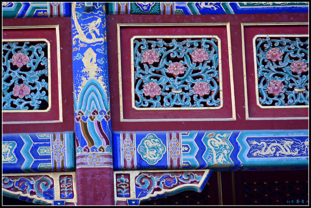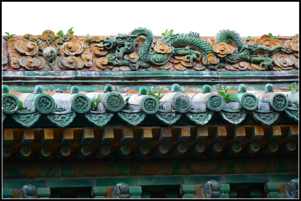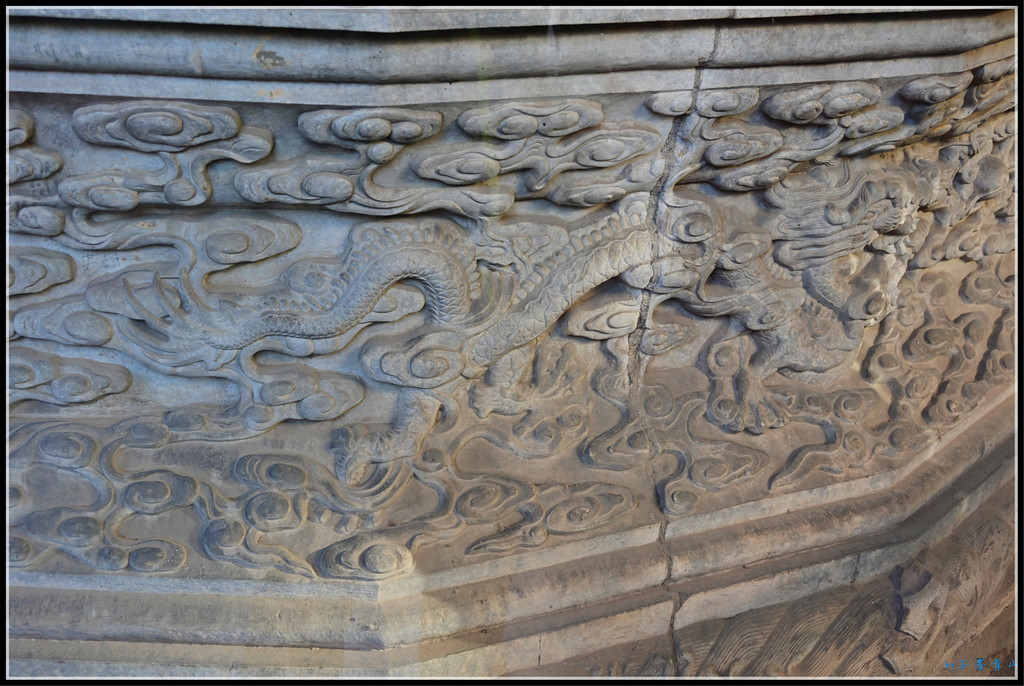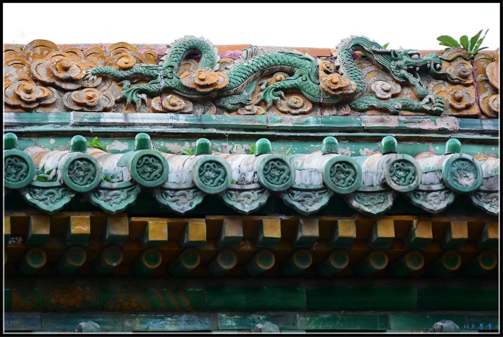 门之间的琉璃墙上琉璃龙雕做工精湛细腻。