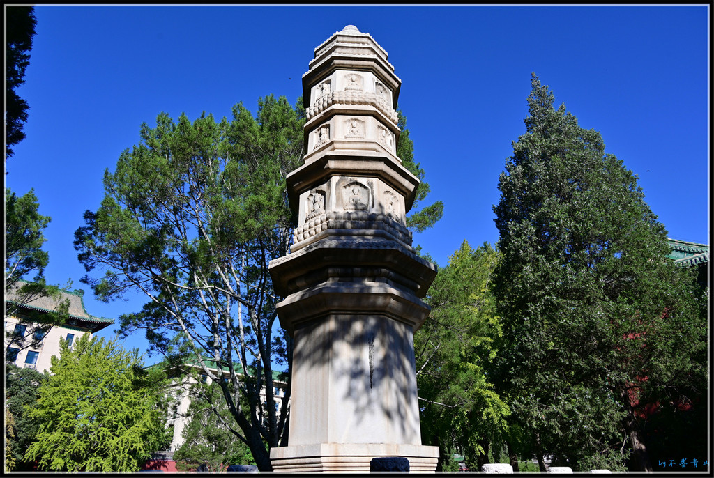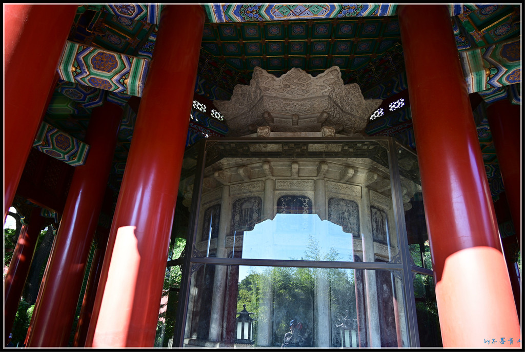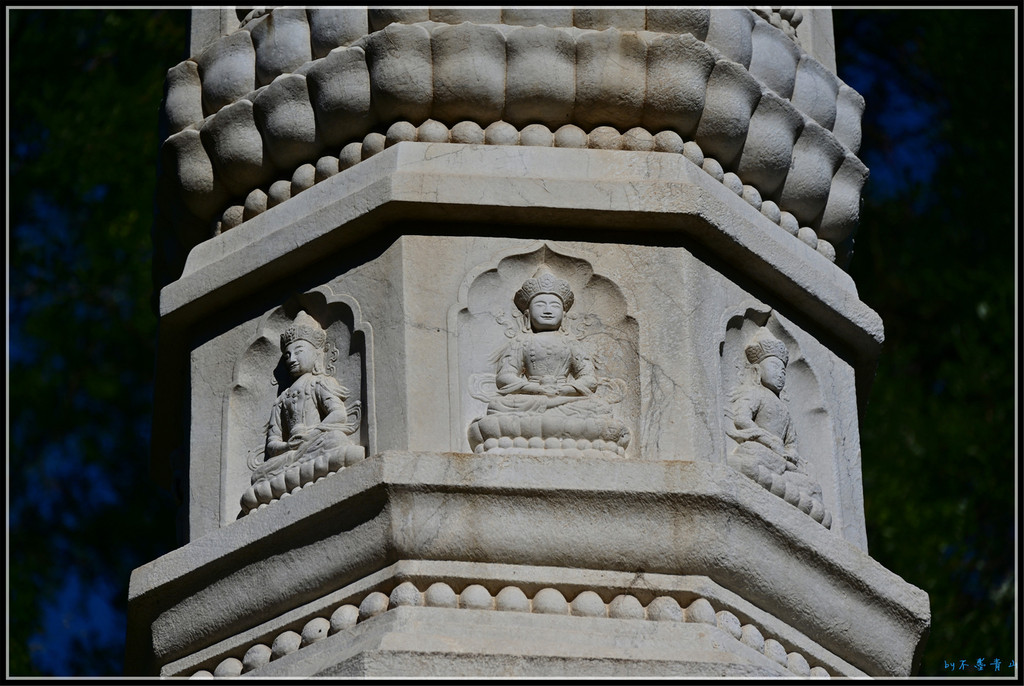 妙相亭内更别有洞天,藏着个大宝贝。亭内竖立一座由汉白玉石雕琢而成的十六角石塔,塔身嵌十六应真像石刻,系仿五代名僧贯休所绘"十六应真像"而摹刻。塔上还刻有乾隆帝题《贯休画十六应真像赞》和跋语及僧人明水题镌石记文。