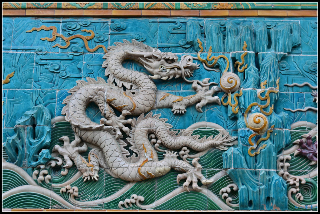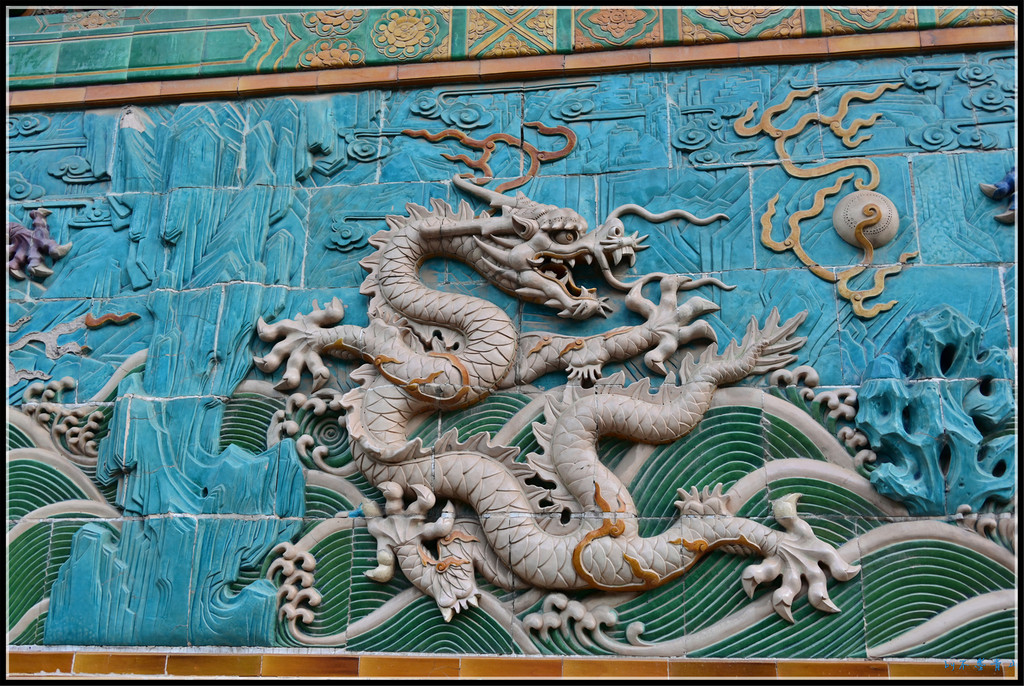 九龙壁上面的九龙,正中的为正龙,两侧的分别为升龙和降龙。九龙腾飞,神态各异。正龙威严、尊贵,升龙刚猛而充满力量,降龙温文尔雅。整个九龙壁寓意:群贤共济,圆满如意、蒸蒸日上的盛世景象。