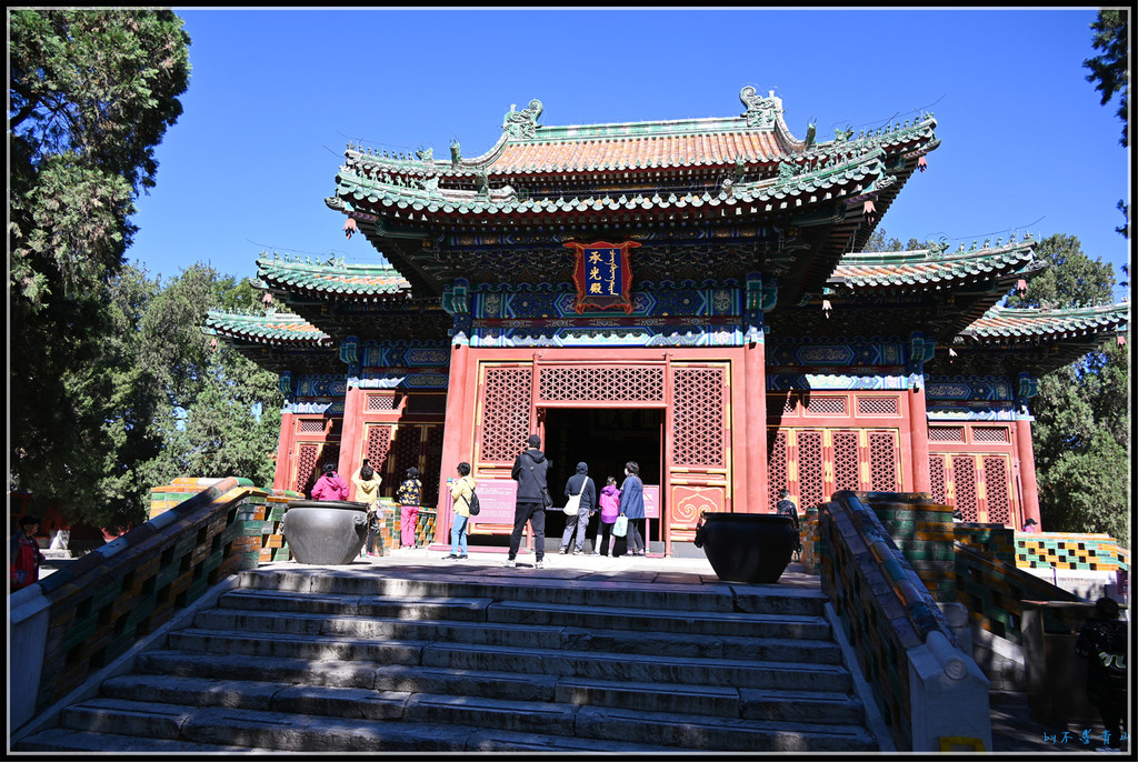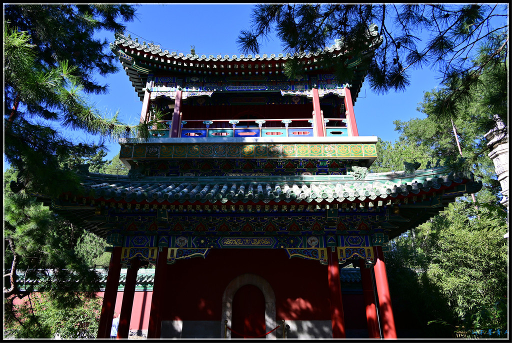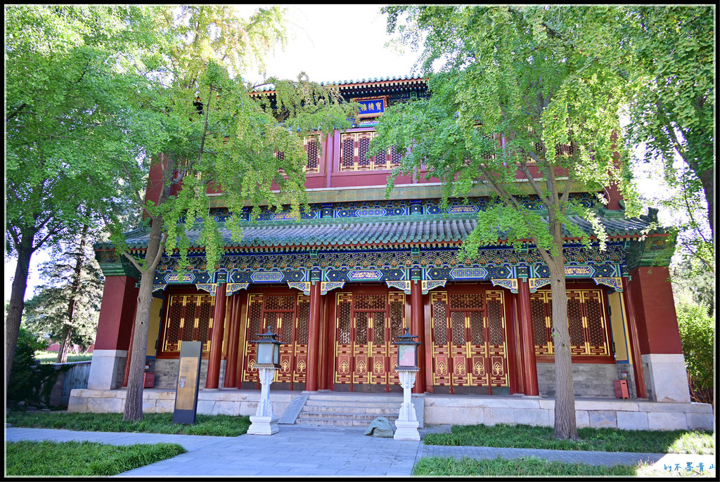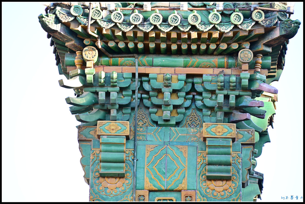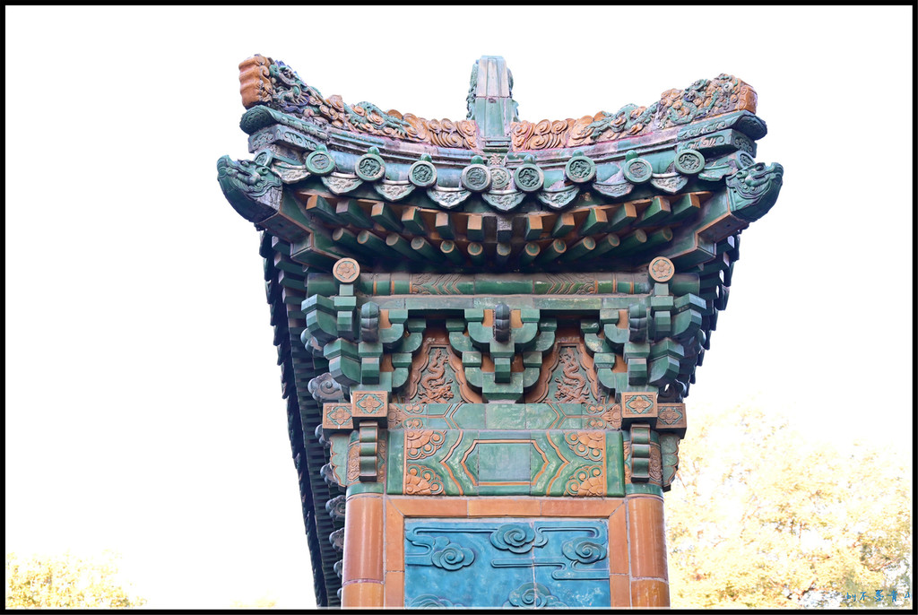 大殿东西南北各有琉璃牌坊一座。据统计,北京现存琉璃牌楼有10座,北海公园占5座,除了小西天4座,还有大西天1座。香山昭庙、植物园卧佛寺、颐和园智慧海的琉璃牌楼我看过,东岳庙、国子监的将来一定抽时间去看。