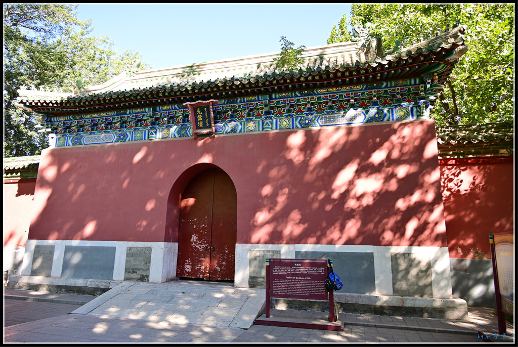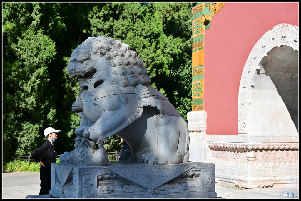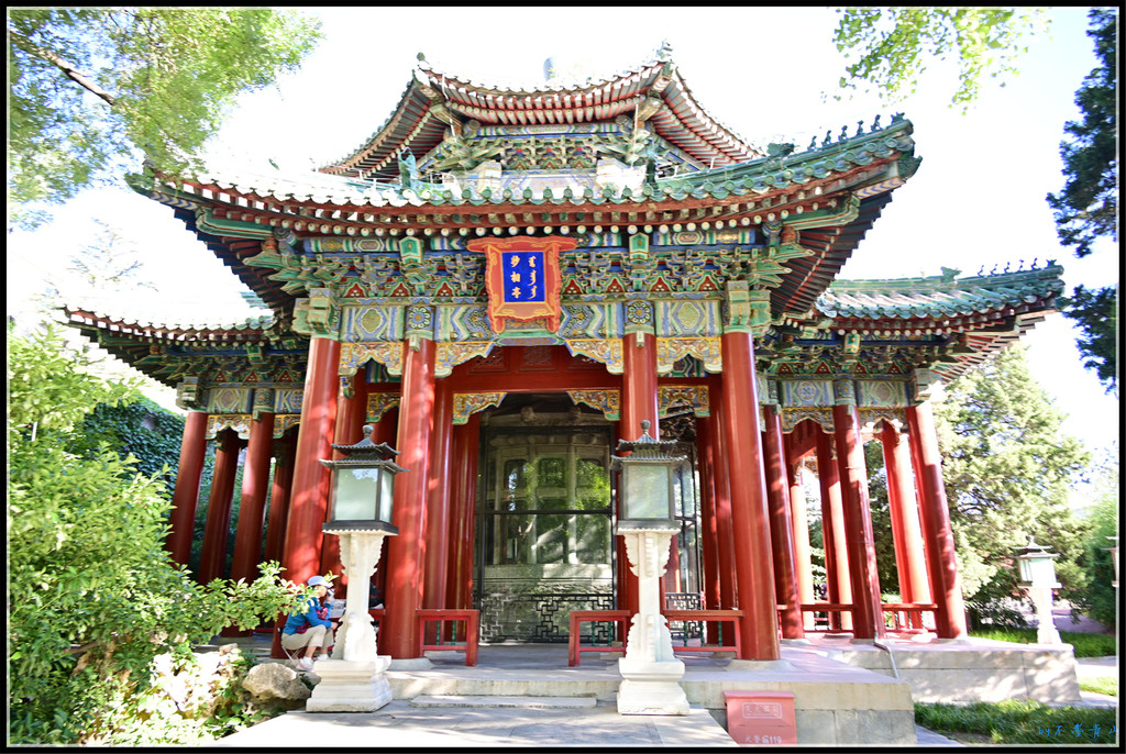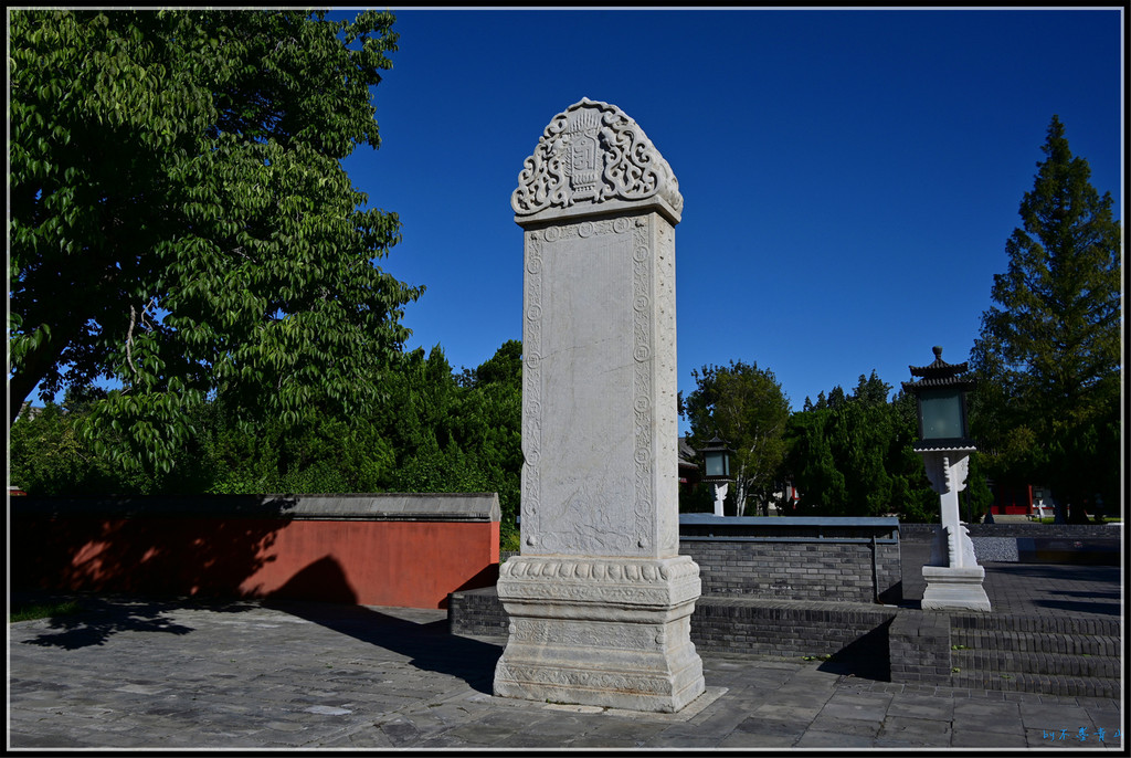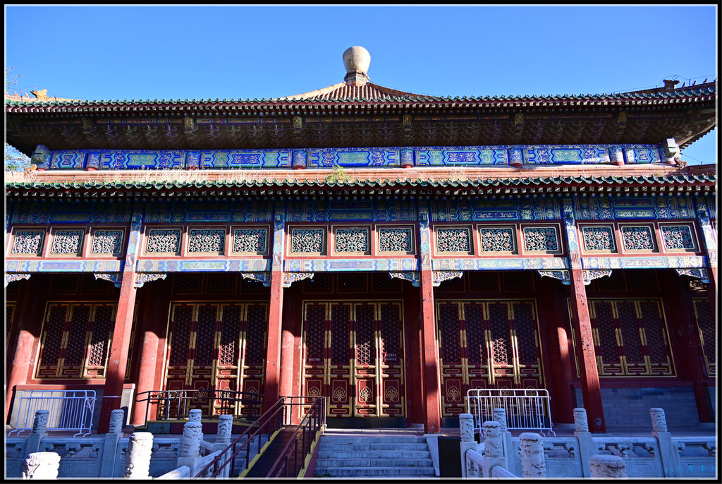 大殿东西南北各有琉璃牌坊一座。据统计,北京现存琉璃牌楼有10座,北海公园占5座,除了小西天4座,还有大西天1座。香山昭庙、植物园卧佛寺、颐和园智慧海的琉璃牌楼我看过,东岳庙、国子监的将来一定抽时间去看。