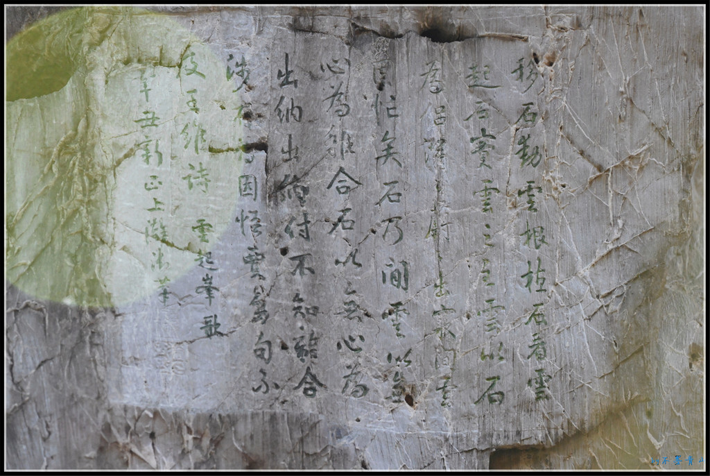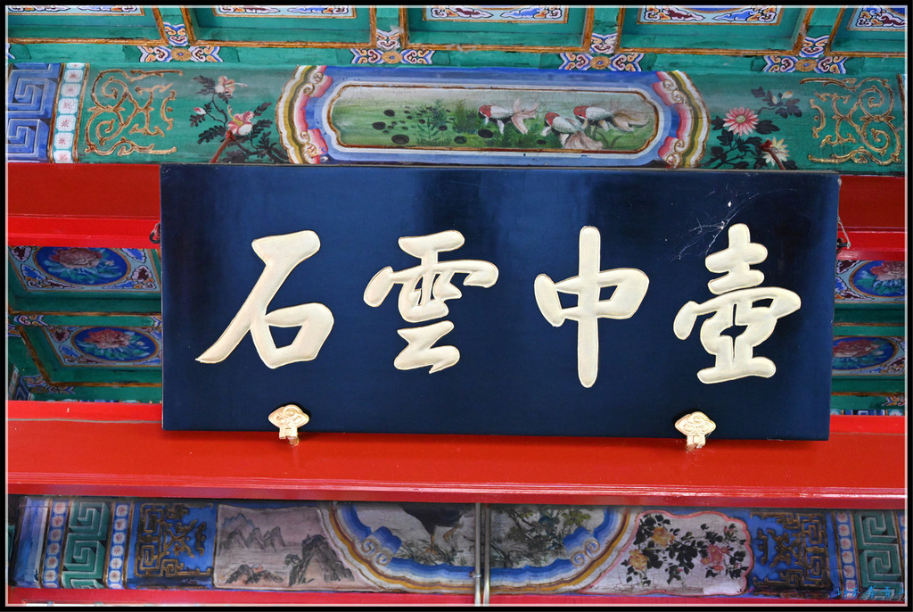 牌楼正面雕刻乾隆御笔对联:蘅皋蔚雨生机满, 松嶂横云画意浓。横楣 :汀兰岸芷吐芳馨。石牌楼背面楹联为:日永亭台爽且静 ,雨余花木秀而鲜。横楣 :山色波光相罨画。