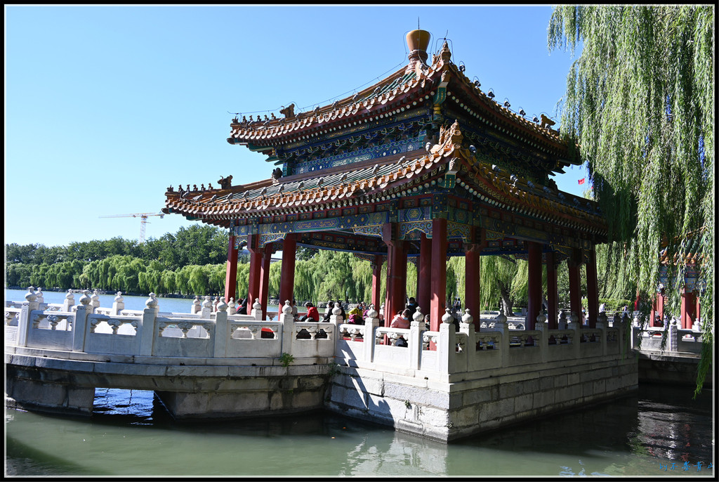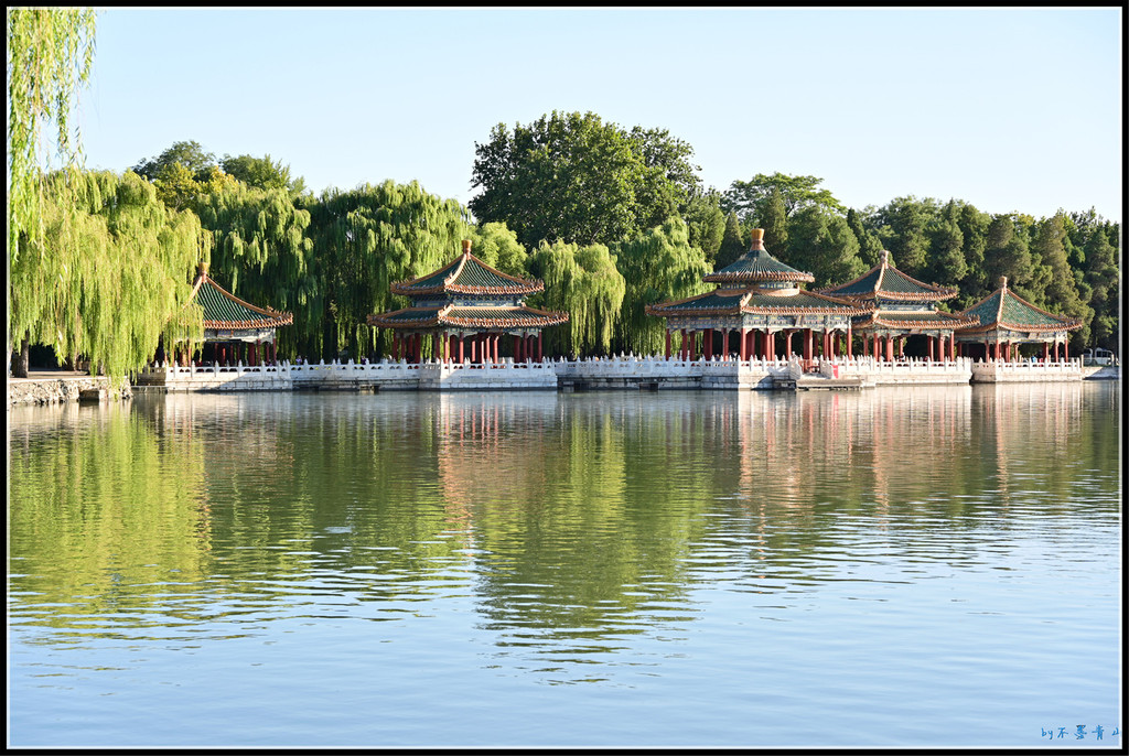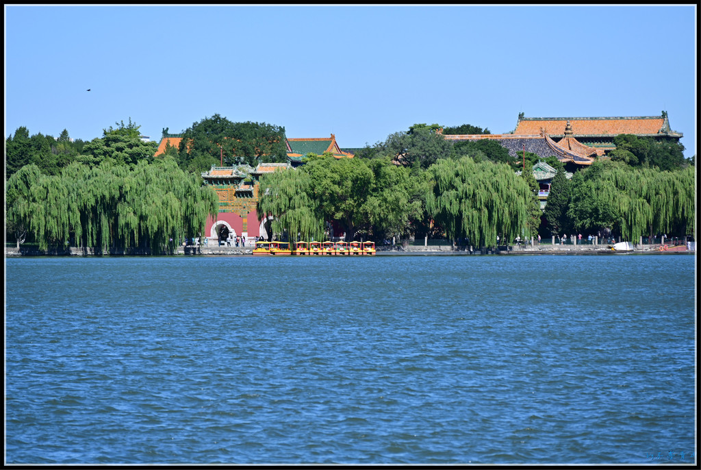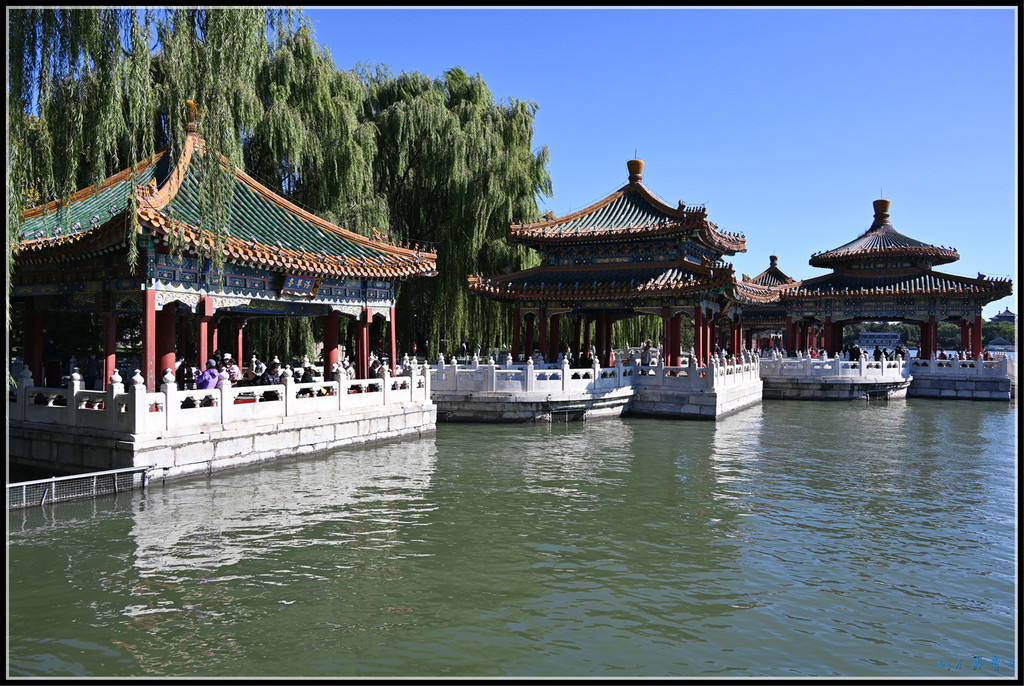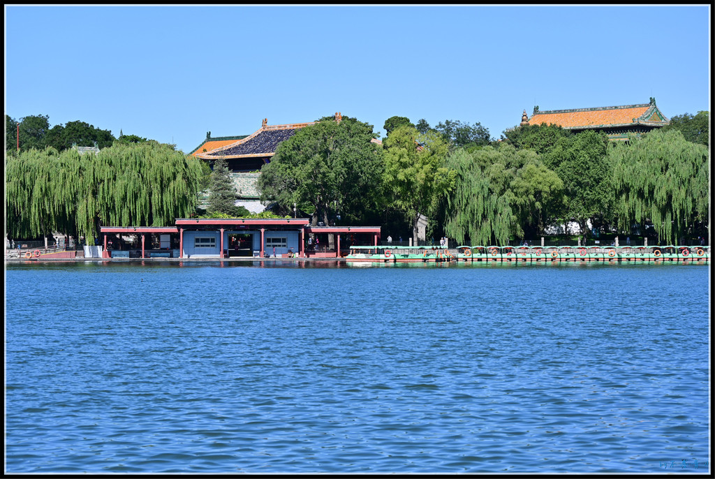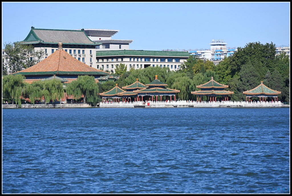 继续沿东岸南行,北岸的五龙亭、大、小西天、阐福寺等建筑掩映在一片翠绿中,蔚蓝的太液池碧波荡漾。