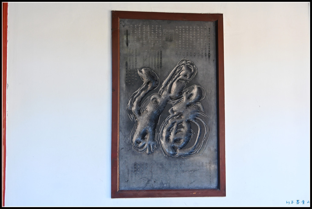 九龙壁,为五脊四坡顶,正脊上两面各有九条龙,垂脊两侧各一条,正脊两吻身上前后各一条,吞脊兽下,东西各有一块盖筒瓦,上面各有龙一条,五条脊共有龙32条。