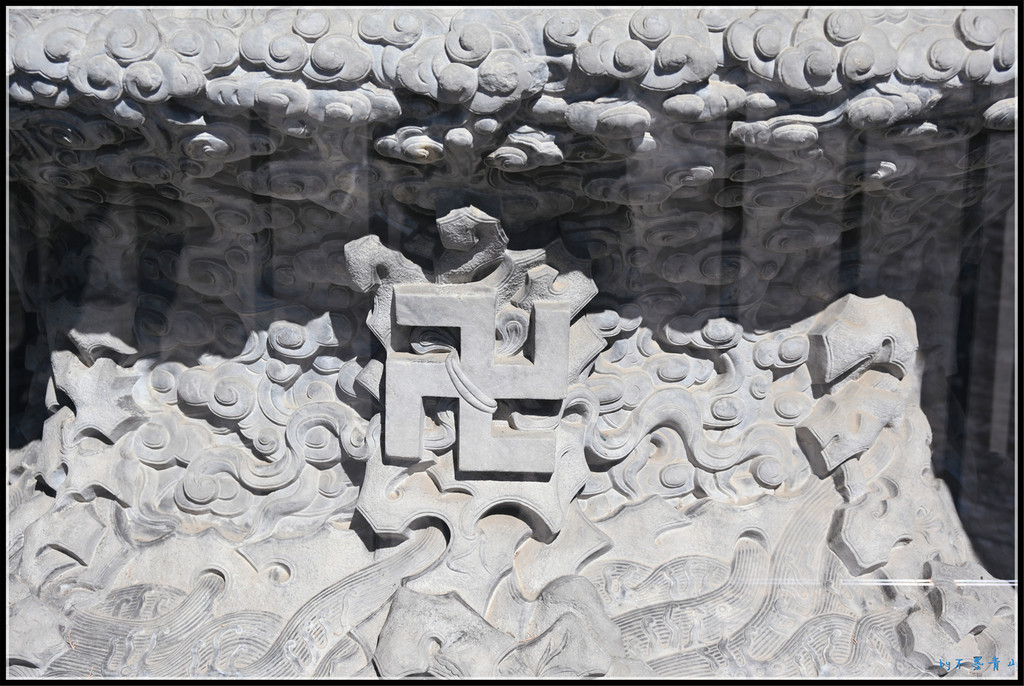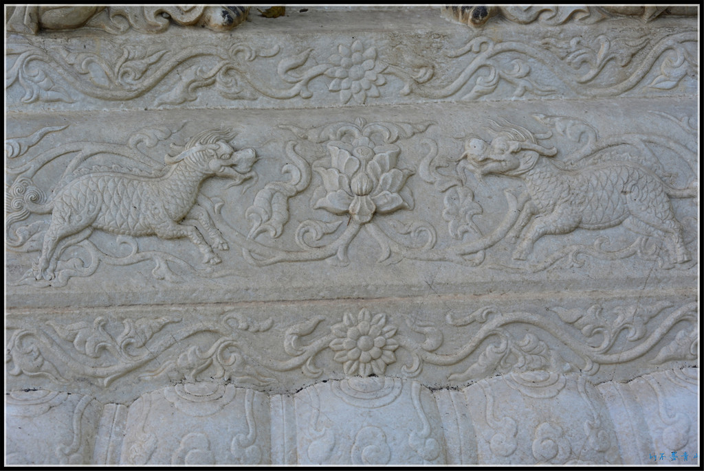 山门台阶正中丹陛石的二龙戏珠浮雕,神采奕奕,栩栩如生。这块汉白玉丹陛石,石质细腻,雕刻精细,是难得的石刻艺术精品。
