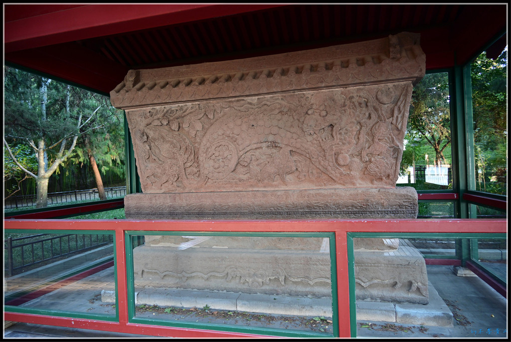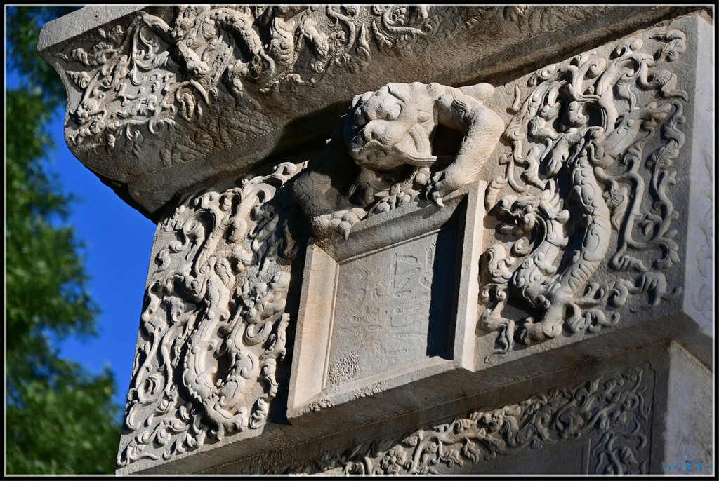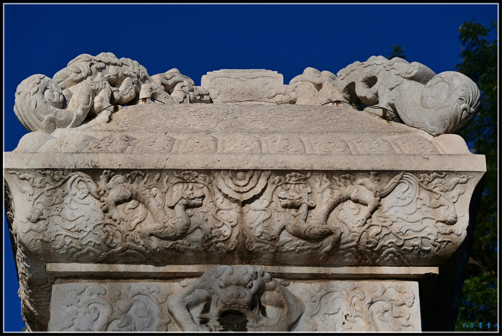 石碑底部基座周围雕饰了狮子、麒麟、海牛、天马、龙虾等动物,形象逼真,栩栩如生。