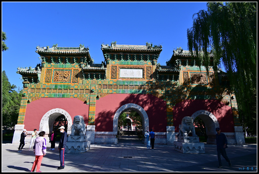 山门前一座高大、精美琉璃牌楼,基座和门洞均由汉白玉构成,顶为琉璃仿木结构,与香山昭庙牌楼和植物园卧佛寺牌楼式样、高度均差不多。