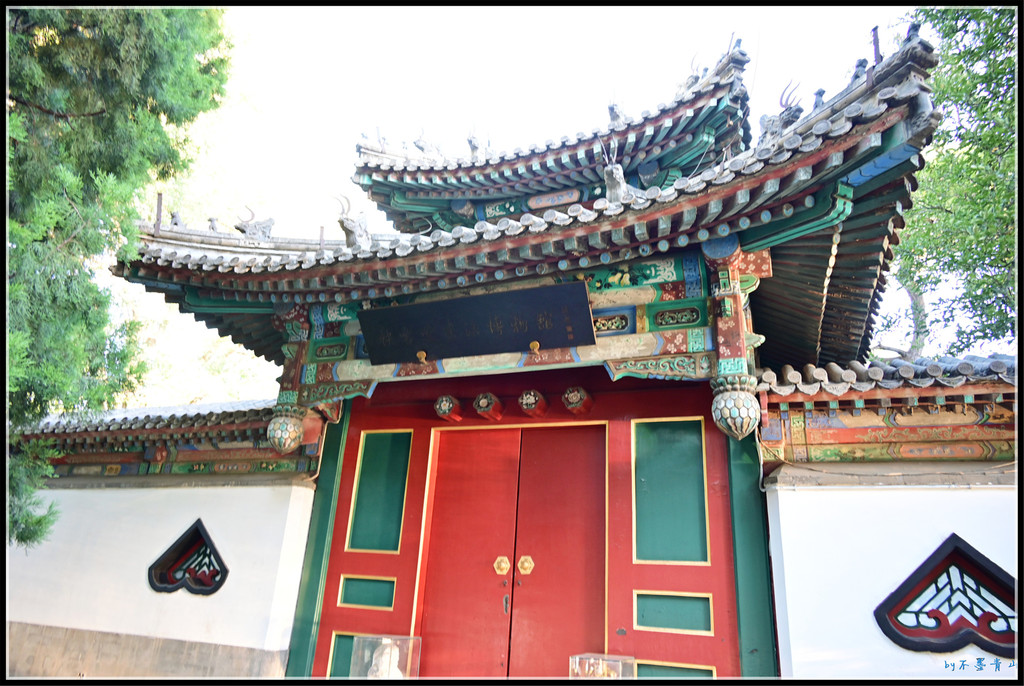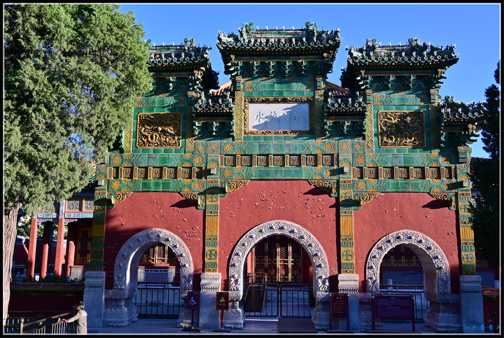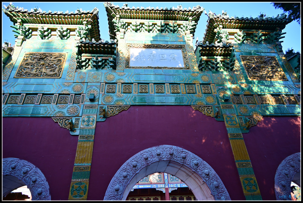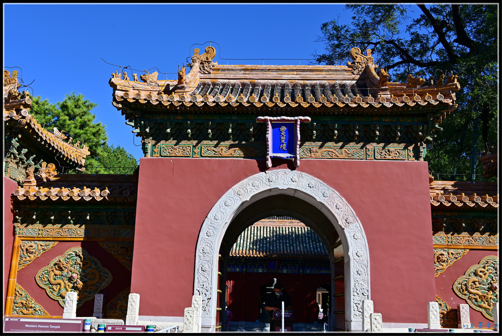 山门为三座歇山黑琉璃黄剪边顶仿木结构券门,门之间有琉璃墙,中间门额为“西天梵境”。