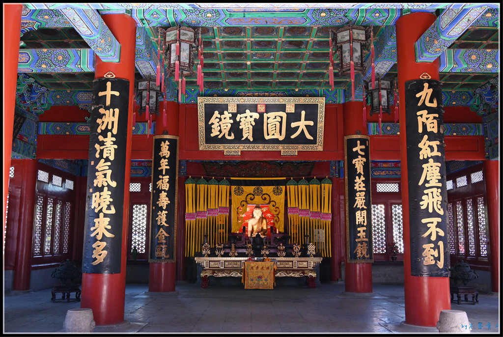 殿内供三世佛,匾额恒河演乘。殿内外所有匾额、对联皆为乾隆御笔。