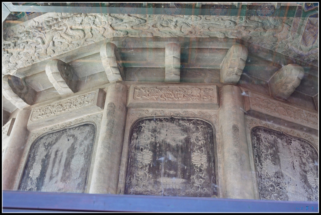 目前三座正房都关闭,里面的内容不得而知,只能见到两侧游廊的石刻。