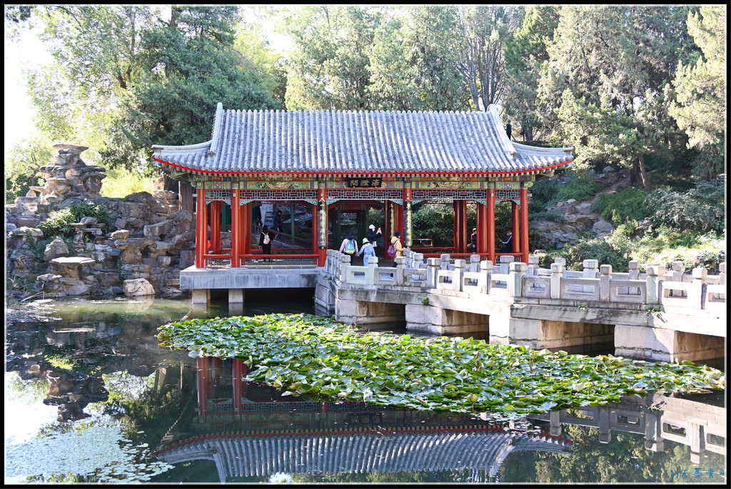 过牌楼,是一座曲桥,曲桥把满池的碧水一分为二。