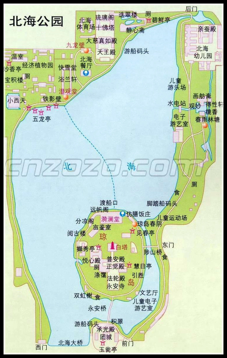 早上六点开园,沿北岸西行,先看那些开放的景点,有门儿的景点要8点才开门。游览顺序:九龙壁、铁影壁、五龙亭、小西天、万佛楼石碑、西岸,至西门返回,万佛楼遗址、阐福寺、快雪堂、仿膳饭庄、西天梵境、静心斋、先蚕坛、画舫斋、濠濮间、南门、团城。