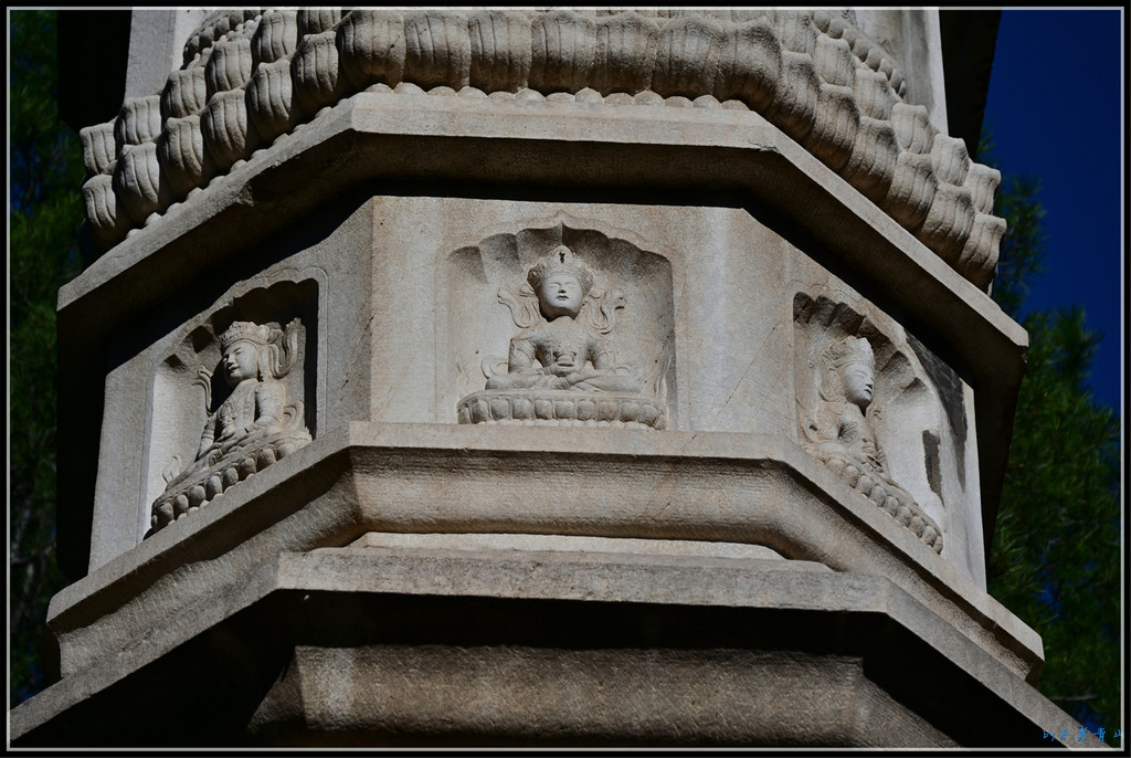 塔顶部有一层八角形石雕塔檐,下层檐有石雕的椽头和狮子头。塔座为须弥座 ,束腰雕有双龙戏珠。塔身等分为十六面,由转角圆柱间隔,每一面又分为上下两层 ,下面的雕刻一尊罗汉肖像,上面的雕刻罗汉的梵文名,石塔十六面共雕刻了十六尊罗汉。十六尊罗汉像是石刻艺术中的珍品。