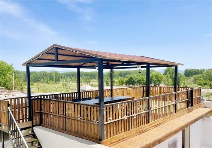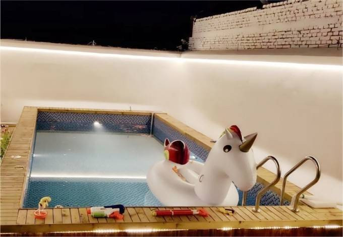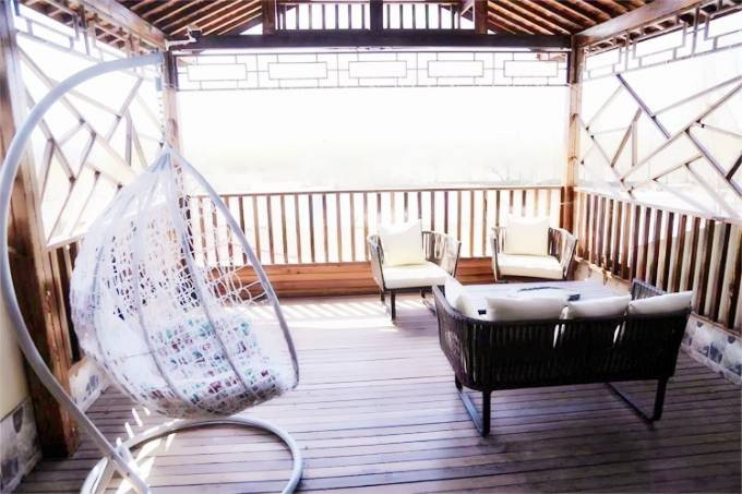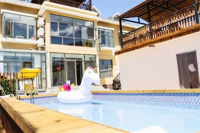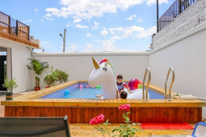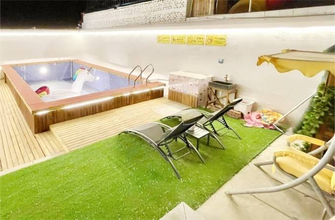亮点设施:小院中间有游泳池,水深在1米左右,孩子们可以随时随地可以跳入的游泳池尽情的玩耍,还增添了各类趣味水玩具供儿童玩耍,搭配安全无忧的浅水池,泳池旁有太阳椅可供休息。院内露台在40平米,景色宜人,露台对面为鱼塘,民宿有烧烤区,提供烧烤架,吊篮,桌椅可以容纳10人。