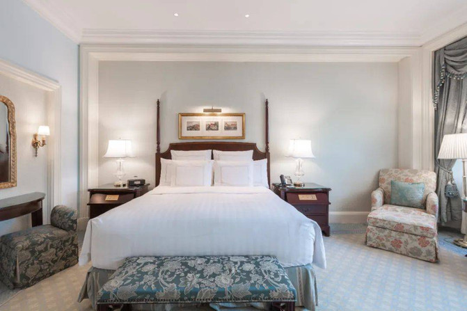 酒店的客房设计延续了英式庄园风格,宽敞明亮,精致典雅,客房则采用浅蓝和浆果红的混合色调,更显优雅,使人倍感温馨舒适。