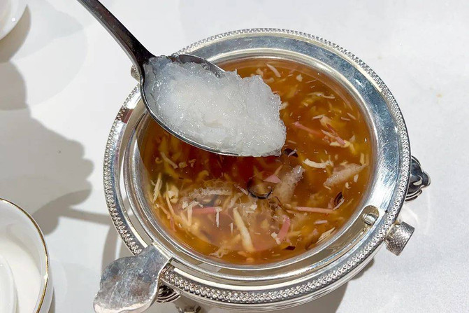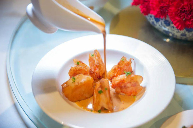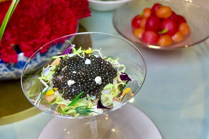 这次在玉餐厅品尝到了厨师精心安排的菜肴,鱼子酱清汤虾冻冰凉爽口,满勺的燕窝海鲜羹让人大饱口福。