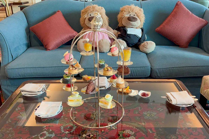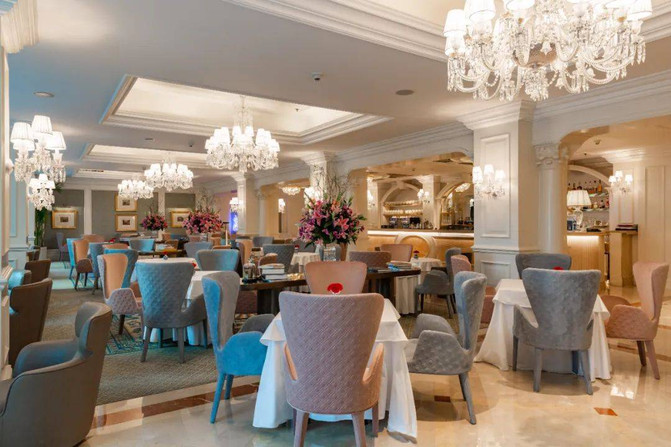 英式庄园风格的大堂酒廊为宾客打造惬意的下午茶时光;莫兰迪蓝色的绒面沙发座椅质感非凡,室内的水晶吊灯璀璨华美,气氛优雅怡人。