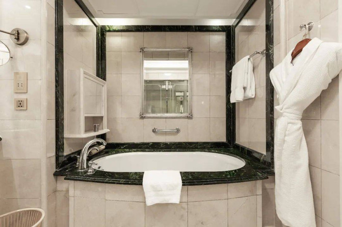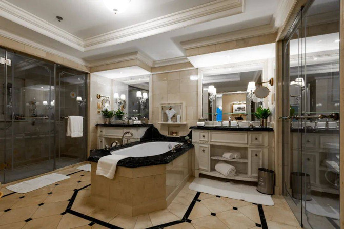 风格古典雅致的浴室空间宽敞,以奶白色和黑色大理石相交而成的地面,大理石墙面和洗漱台,欧式壁灯,处处洋溢着英式风情。浴缸放满水,温度适宜,泡上个热水澡,洗去旅途的疲惫。