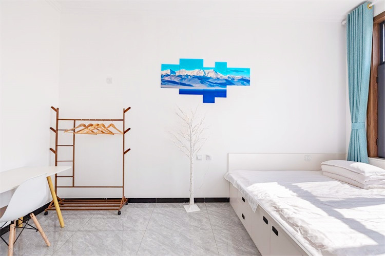 房间的角落里还有木质衣杆衣架,可以挂上换洗的衣物。让客人在感受乡村气息的同时也能获得高品质睡眠环境。