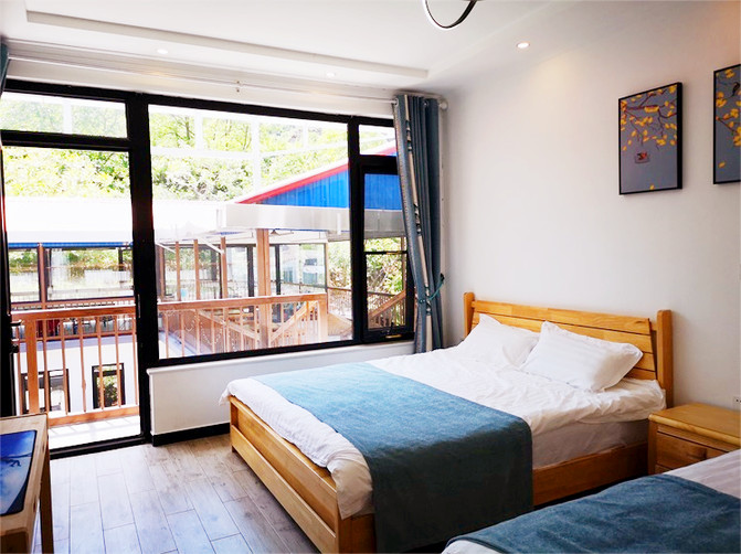 民宿整体采用了大落地窗设计,采光效果棒棒哒,躺在床上就可以捕捉到室外的风景,毫不费力。客房内放置了木质的餐桌椅,客人可以坐在落地窗边,看着窗外美景,享受宁静的下午茶时光。
