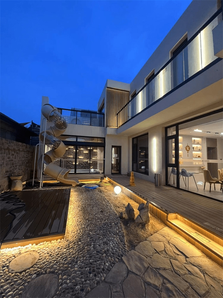 恒温恒压热水系统、四季恒温泳池(带循环过滤系统)、室外庭院自动灯光控制系统。