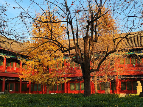 此外,五塔寺内金刚宝塔座外的两棵巨大银杏,树龄有六百年之久。古塔与古树相得益彰,微风吹过,一片婆娑,满地金黄的景象与庙宇中金碧辉煌的建筑风貌交相辉映,在阳光照耀下闪闪发光,呈现出皇家寺院的一派威严气势。在此静心遐想,令人无不对中国传统古建艺术的博大精深而回味无穷。(图文:冯赣勇)