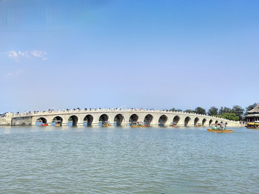 2、下午颐和园。人真太多。如果打算坐船的,建议从入口苏州桥的地方就开始坐船进,小船换大船,到十七孔桥停。再步行往回走,北如意门出。途经长廊,玉澜堂,铁牛等景点。如果从入口走进去,回来再坐船,排队那是相当的长。这个景点门票+船票,成人55+80,儿童40+70。