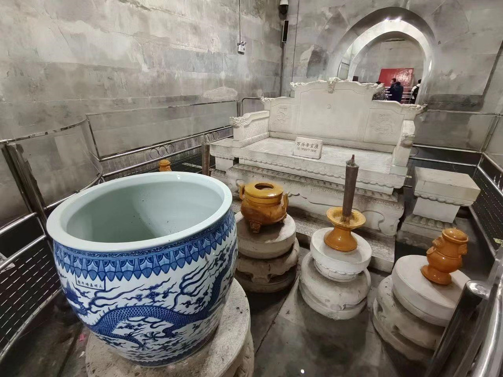 定陵地宫:明定陵的主要景点就是深达地下27米的地下玄宫,它由前后中左右共五个宫室以及三个隧道组成,其中放有万历皇帝及两位皇后的棺柩、神座、长明灯,还有大量随葬品。