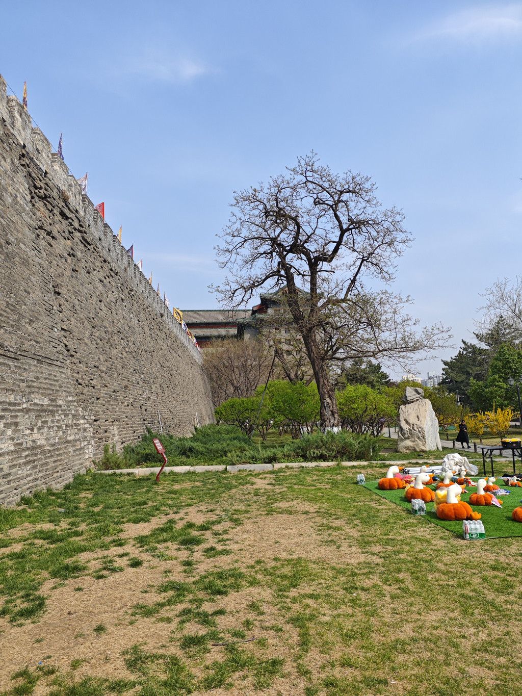 西侧是未经修整的城墙,上面已露出了夯土地基的黄土地,看起来原始古朴。