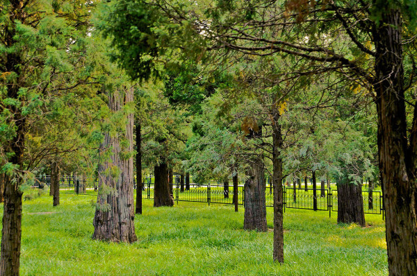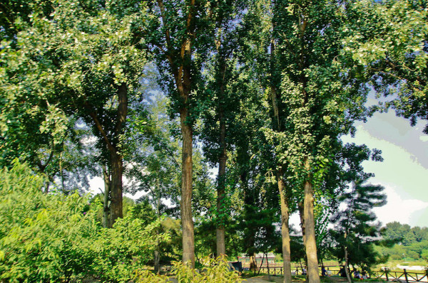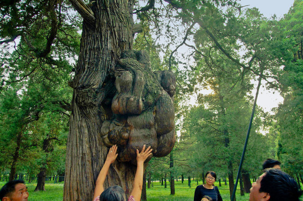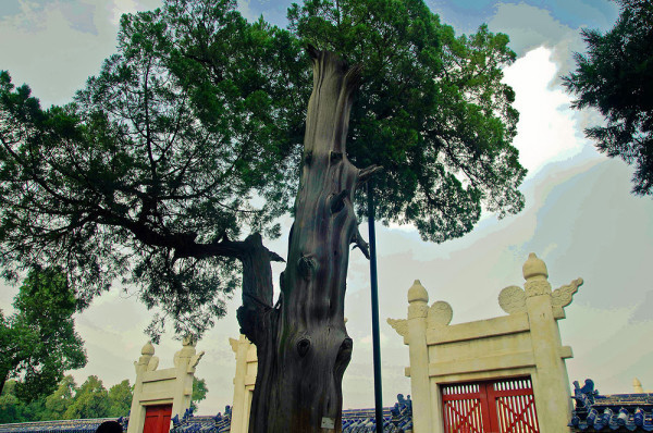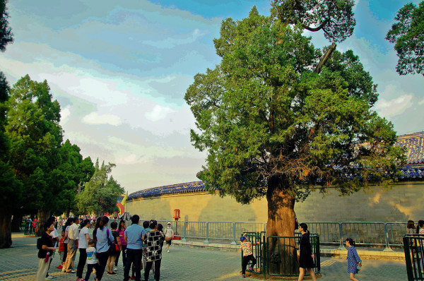 天坛里除了建筑物,便是树的海洋了,大片大片的柏树林,将肃穆的气氛烘托到了极致。据说,这大片的柏林多根植于明清两代。高寿者距今已有七、八百年。树干苍劲,枝叶繁茂,堪称稀世之宝。粗大的树体足够几个人的连手合围。由于年代久远,饱经风蚀,许多树体裸露、扭曲、凸凹、断裂,早现老态龙钟。有的状若堆石累卵,有的形同缠筋绕肠,有的好像残垣断壁、沟壑纵横……。