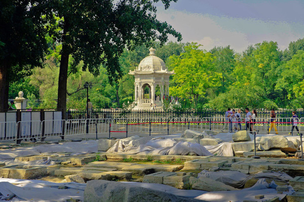 圆明园,坐落在北京 西郊海淀区 ,与颐和园 紧相毗邻。它始建于康熙 46年(1709年),由圆明园、长春园 、绮春园 三园组成。有园林风景百余处,建筑面积逾16万平方米,是清朝 帝王在150余年间创建和经营的一座大型皇家宫苑 。