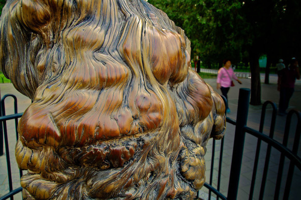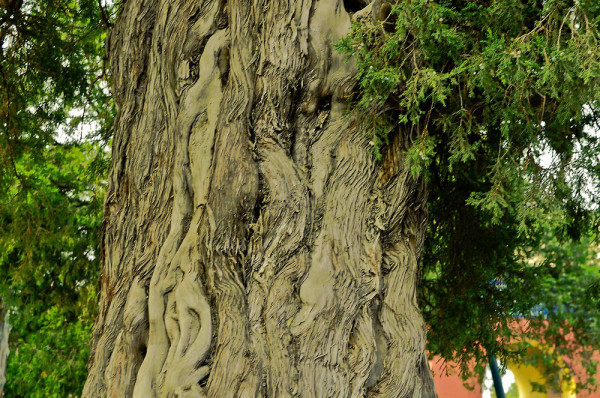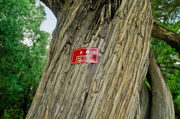 最独特的一棵当属回音壁西侧的“九龙柏”,树冠不大,树干却很粗壮。从树根起,一股股苍灰色密布竖纹的柱状突起树干,扭曲纠结着向上,到顶结束在树杈处,宛如九条盘旋而上、竞相逐走的蟠龙,故此得名。