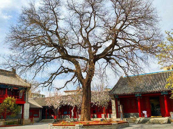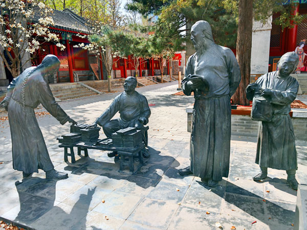 走进庭院,只见藏经阁前有一株500年树龄的古树,周围布置成民俗文化休闲空间,通过四组铜像雕塑展现老北京人的休闲方式;前院为主的士人文化空间内,有“禁烟动议起于宣南”和“士人佳话,访书结缘”两组雕塑。