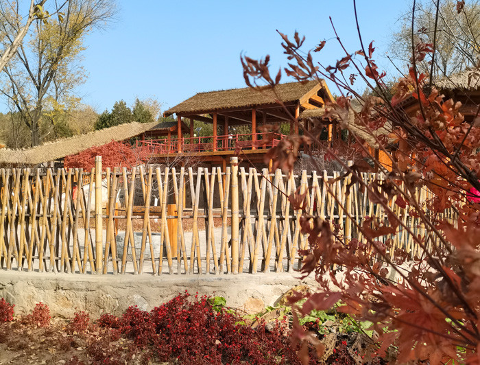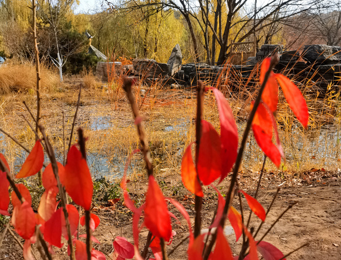 石像前有层叠的岩石,药王谷现在的溪水已经较为稀少接近干涸了。从孙思邈雕像右边下了坡,是一条窄路。向北望去,发现路的右侧有一两棵火红的火炬树,左侧后方有一个乌木顶的亭子。这色彩和景致像极了京都的秋日。
