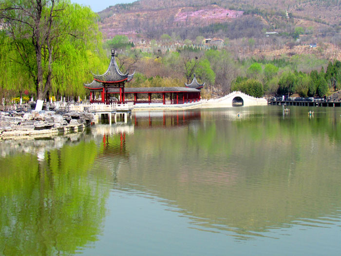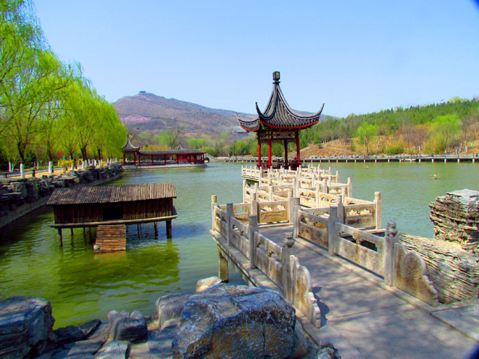 北宫公园除了极乐峰外主要由廊坡顶主峰、东岭旭日、行龙谷、小江南、太公池、古石桥等众多景点组成。小江南位于公园进门处不远的地方。这里湖水面积16308平方米,湖边小桥、挑台、驳岸小路曲折,绿树成荫,游人可在此垂钓、休息,仿佛穿越了时空,把人带到了风光秀丽的江南水乡。