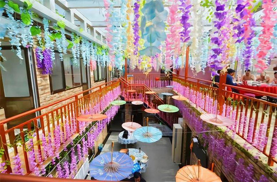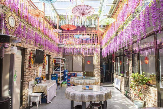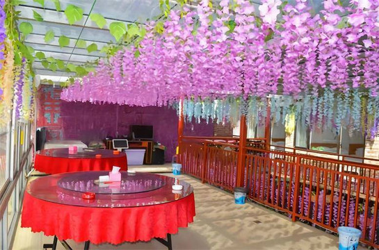望山阁客栈设有宽大的餐厅,干净整洁,容纳多人用餐。餐厅用紫色花藤点缀,让您享受在花丛中用餐体验感。