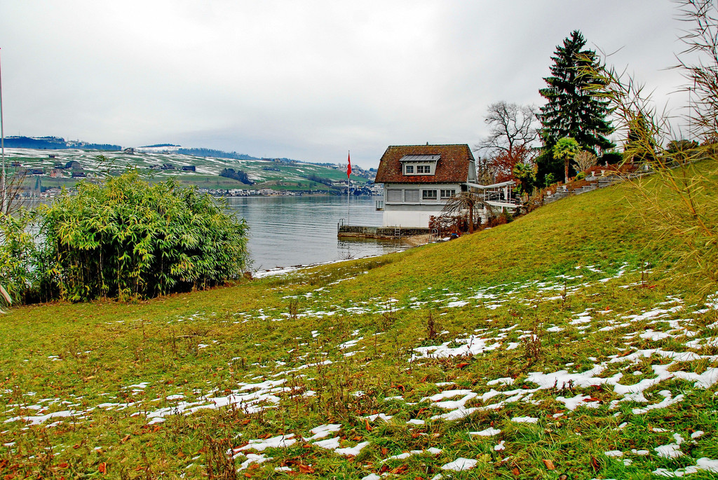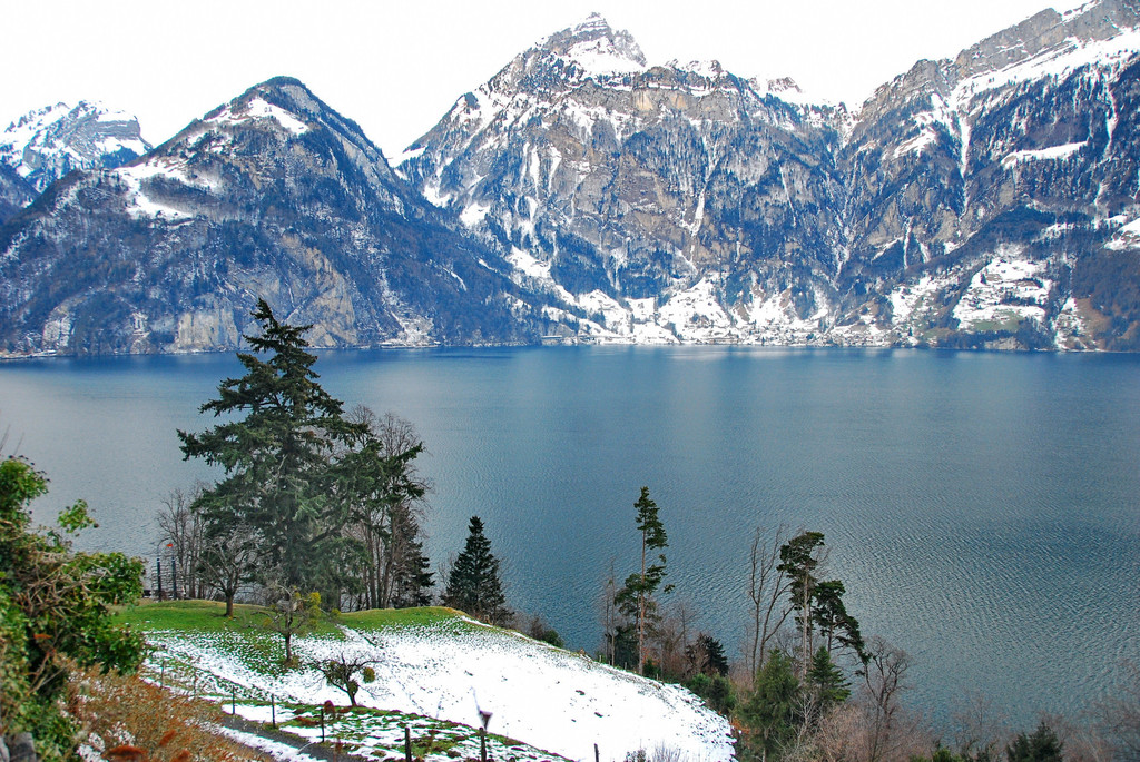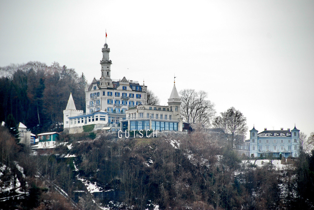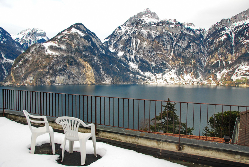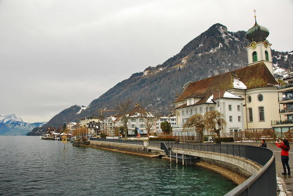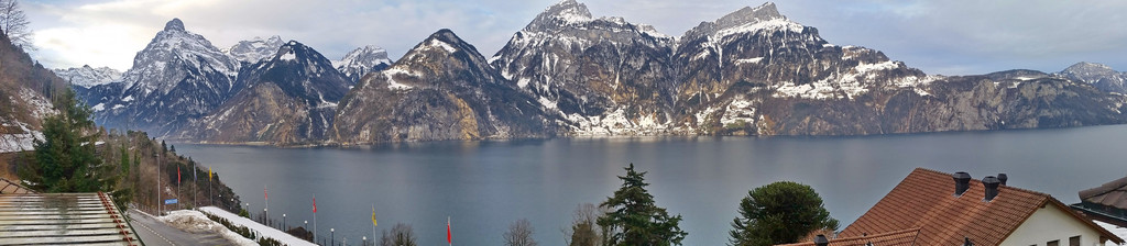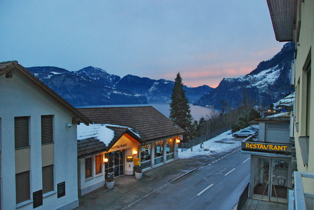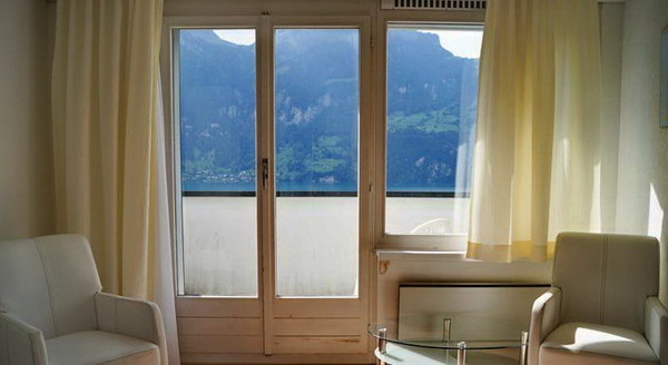 我们住在卢塞恩前面的佛吕埃伦小镇的这个湖滨酒店,景观很好!: