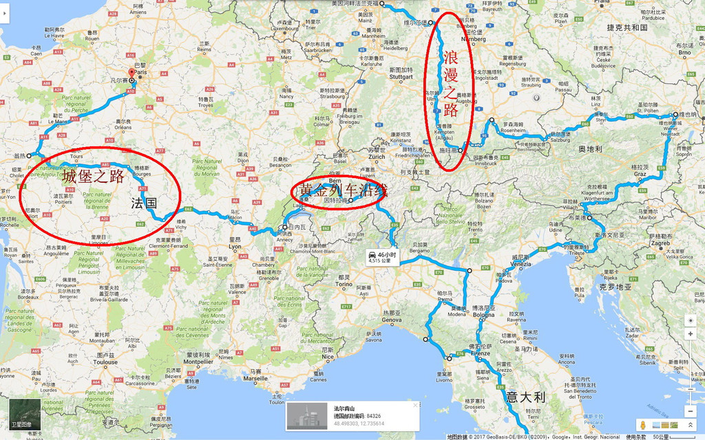我们从深圳直飞法兰克福,机场提车,沿途经奥地利、斯诺文尼亚、意大利、瑞士,进入法国,巴黎戴高乐机场还车回国。