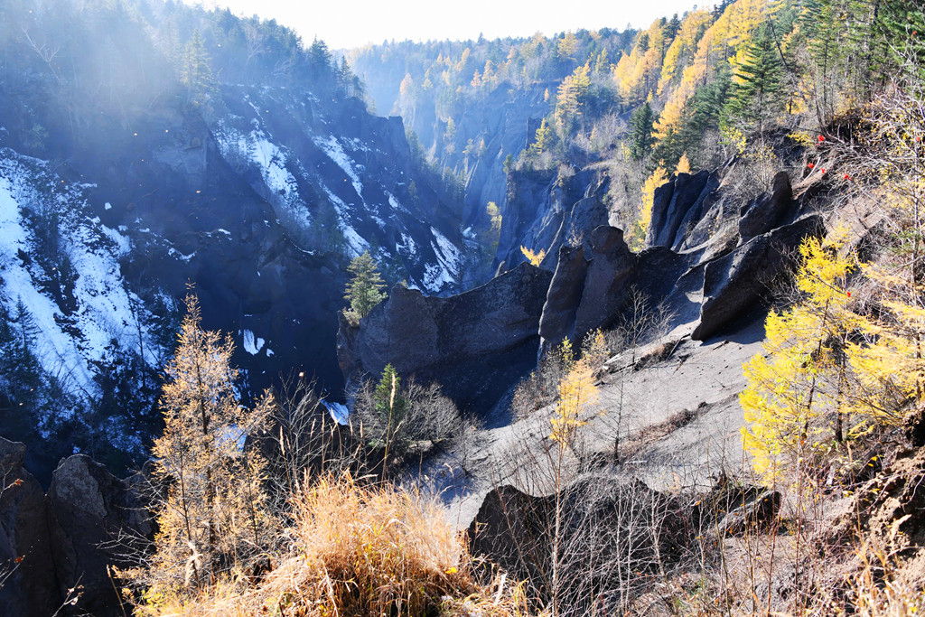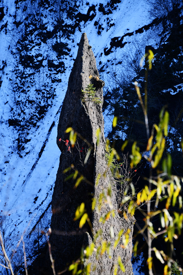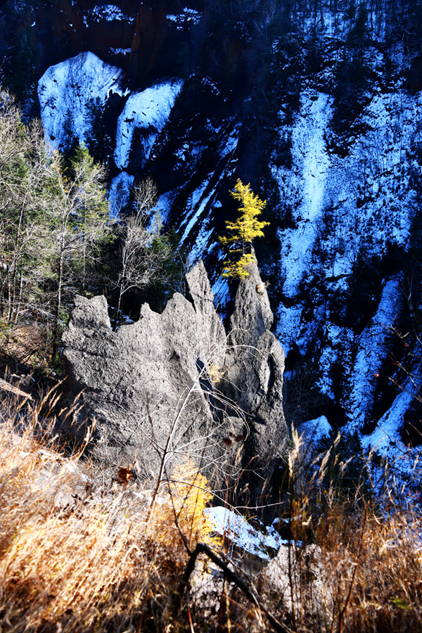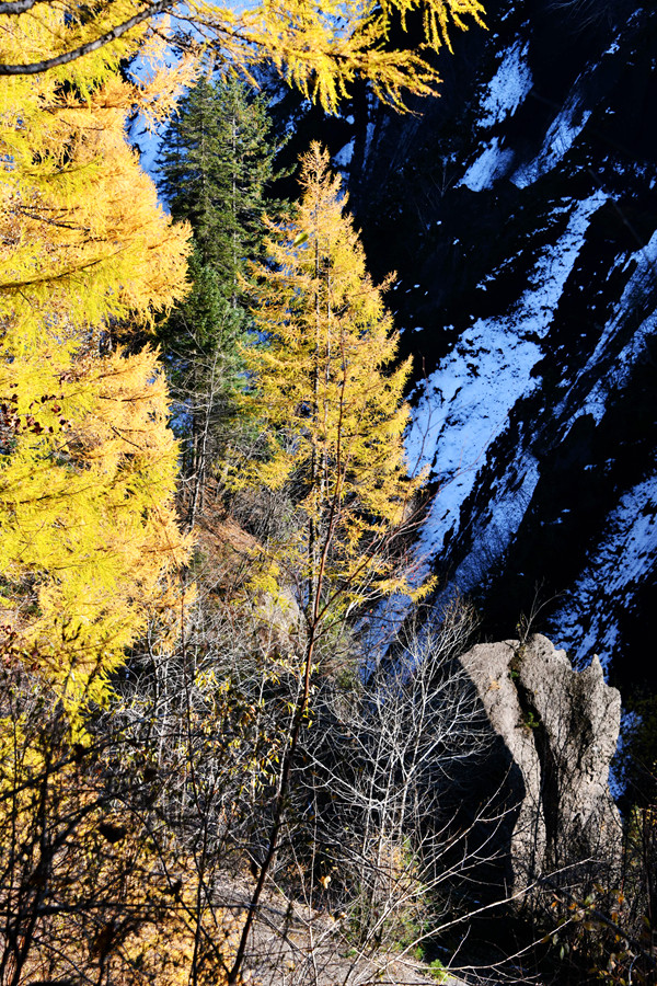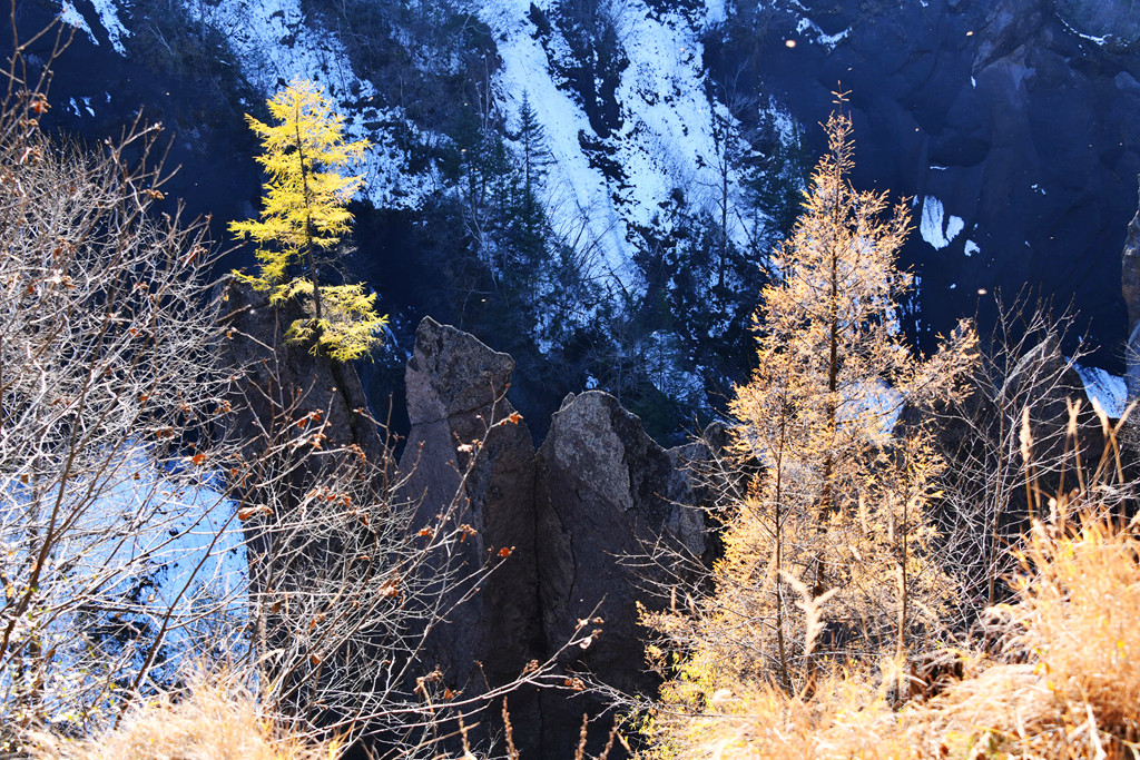 当我第一眼看到它时,立刻被震撼了!这不同于我以往看过的任何一座峡谷,午后的阳光打到山谷,向阴的一侧崖壁上覆盖着白雪,光线正好打到从谷底向上突起的尖峭黝黑岩石上,被金黄色草丛树叶环裹着,漂亮极了,就好像一个放大的山水盆景。