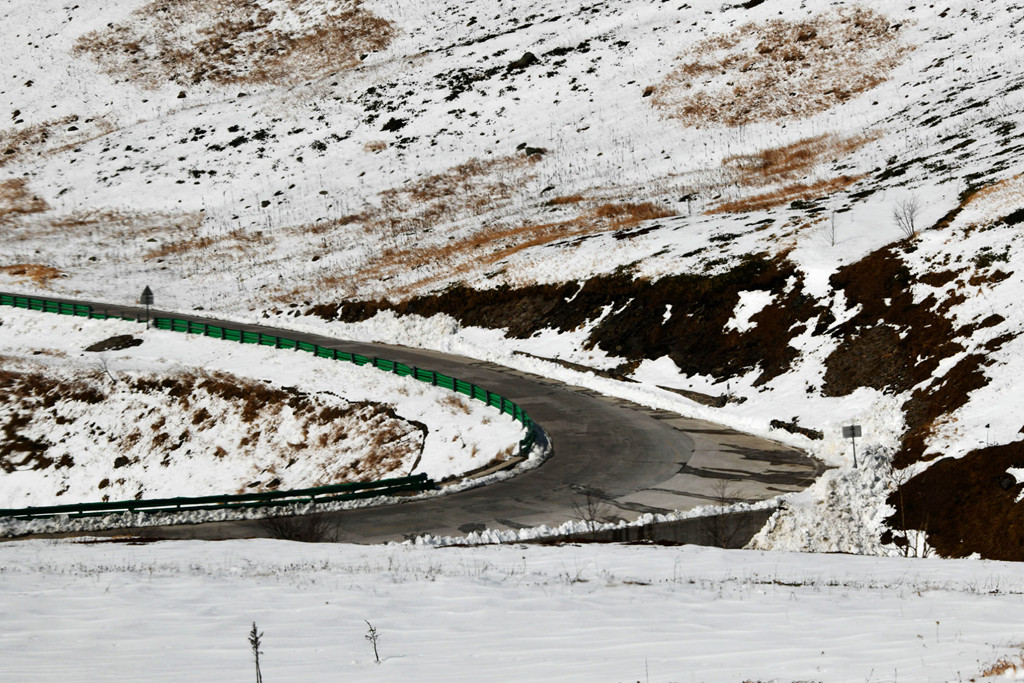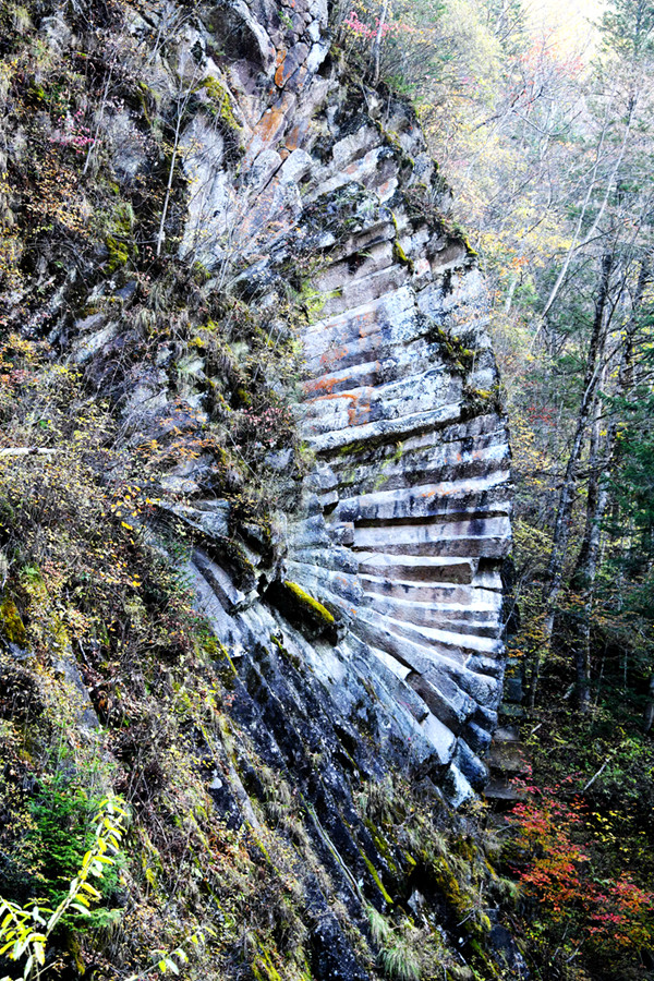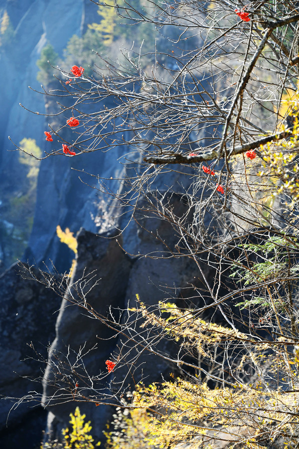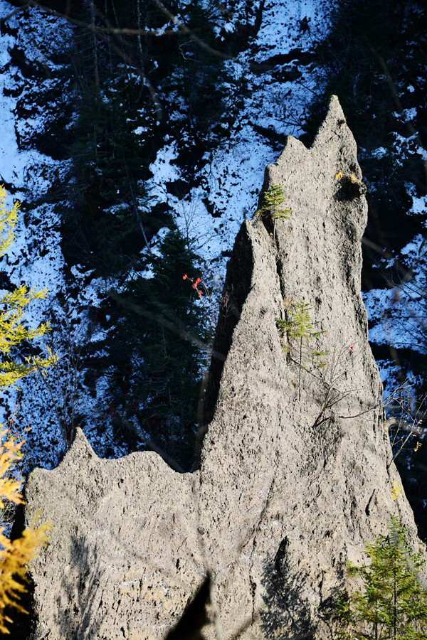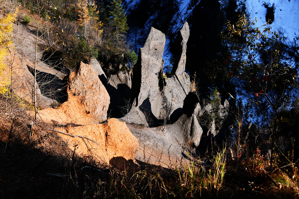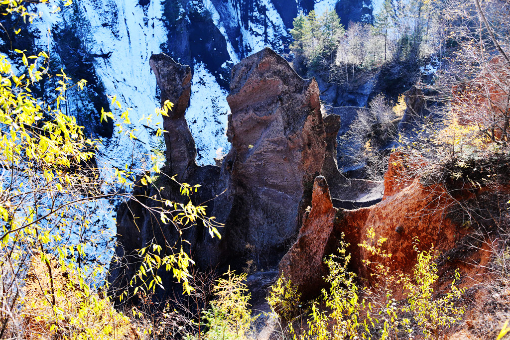 当我第一眼看到它时,立刻被震撼了!这不同于我以往看过的任何一座峡谷,午后的阳光打到山谷,向阴的一侧崖壁上覆盖着白雪,光线正好打到从谷底向上突起的尖峭黝黑岩石上,被金黄色草丛树叶环裹着,漂亮极了,就好像一个放大的山水盆景。