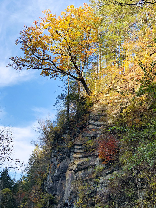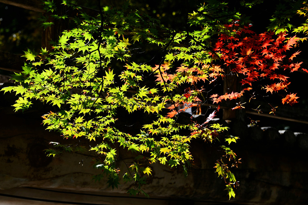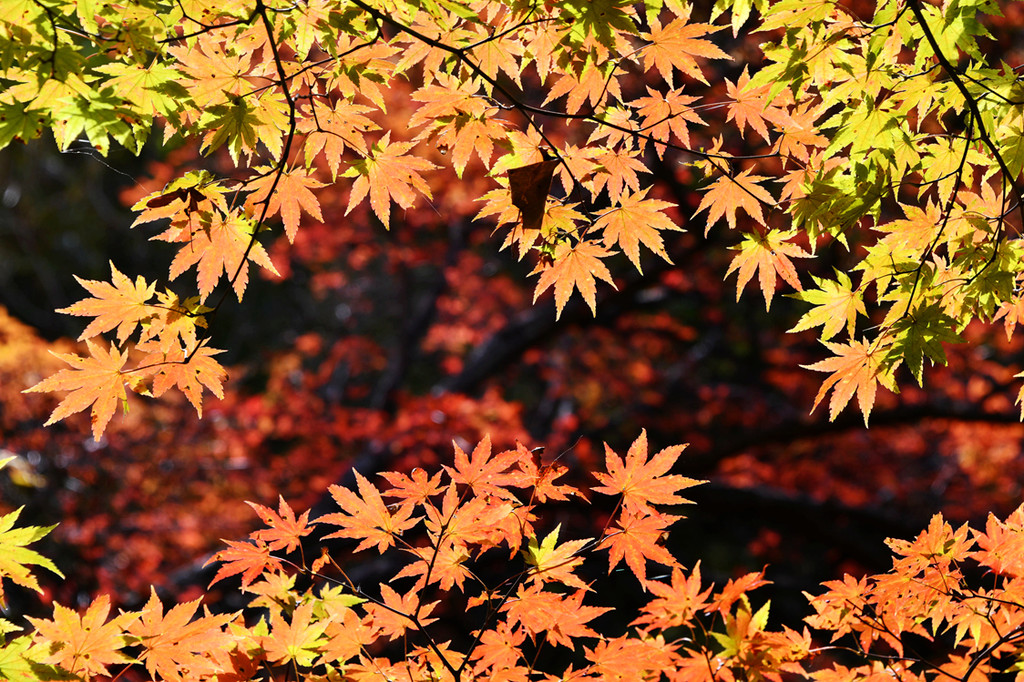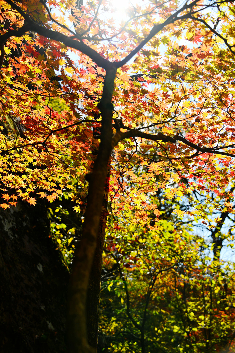 从山上往山下走,一路的惊喜,已是层林尽然,五彩缤纷。关门山红叶以它特有的色彩展现着其独有的魅力。不同的树或同一棵树,竟然能同时展现出红色黄色绿色三色枫叶,绚丽多彩。