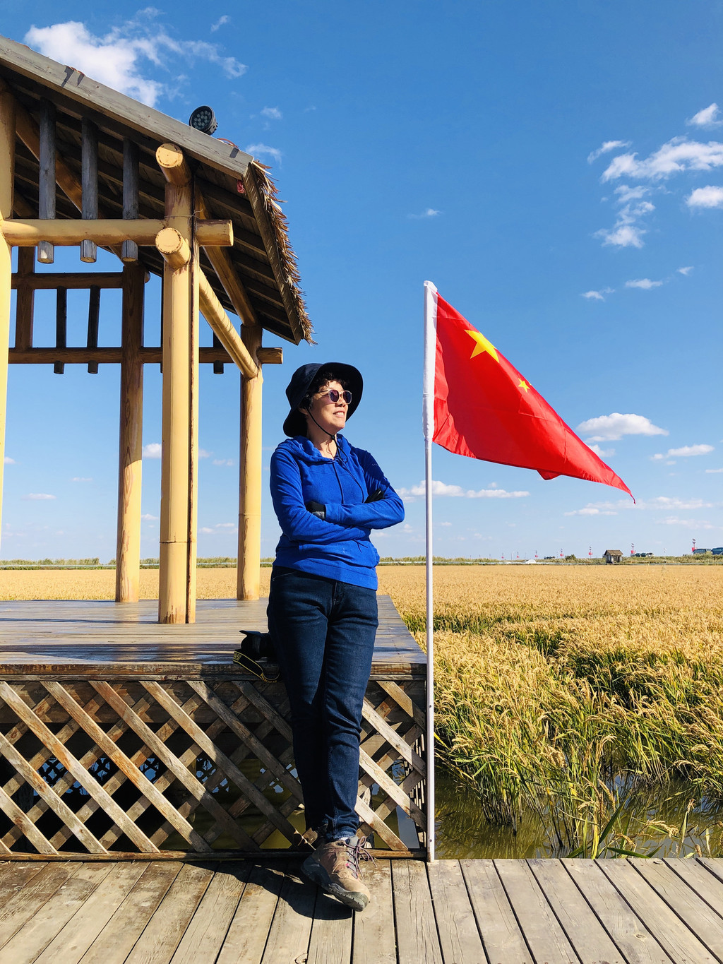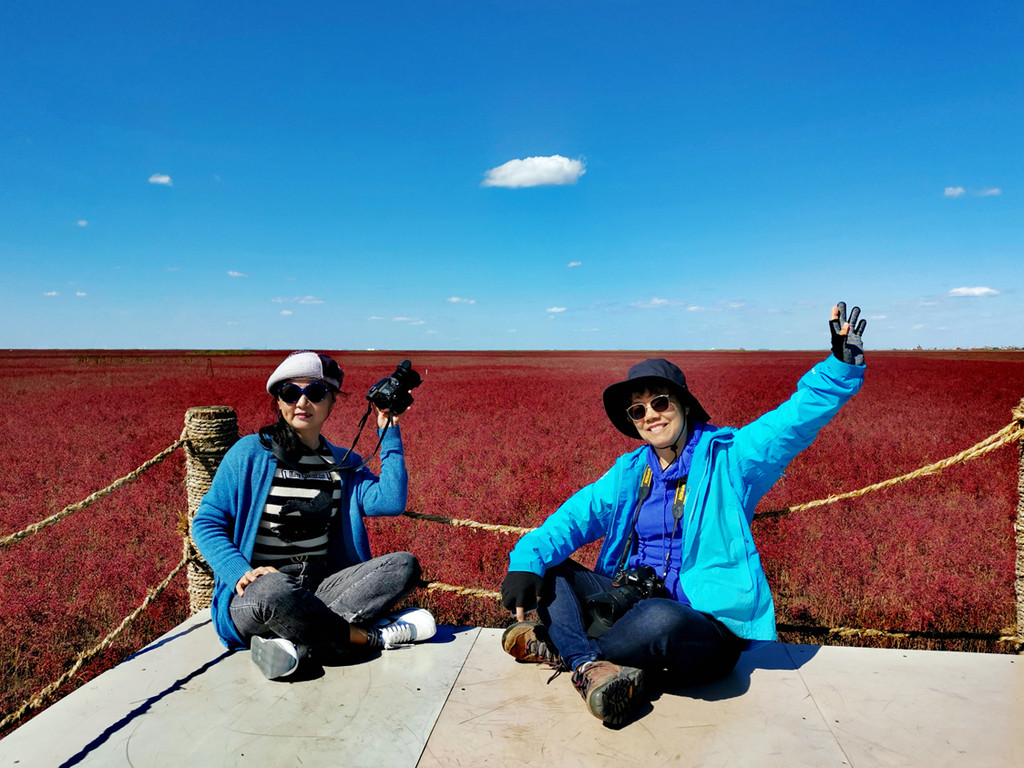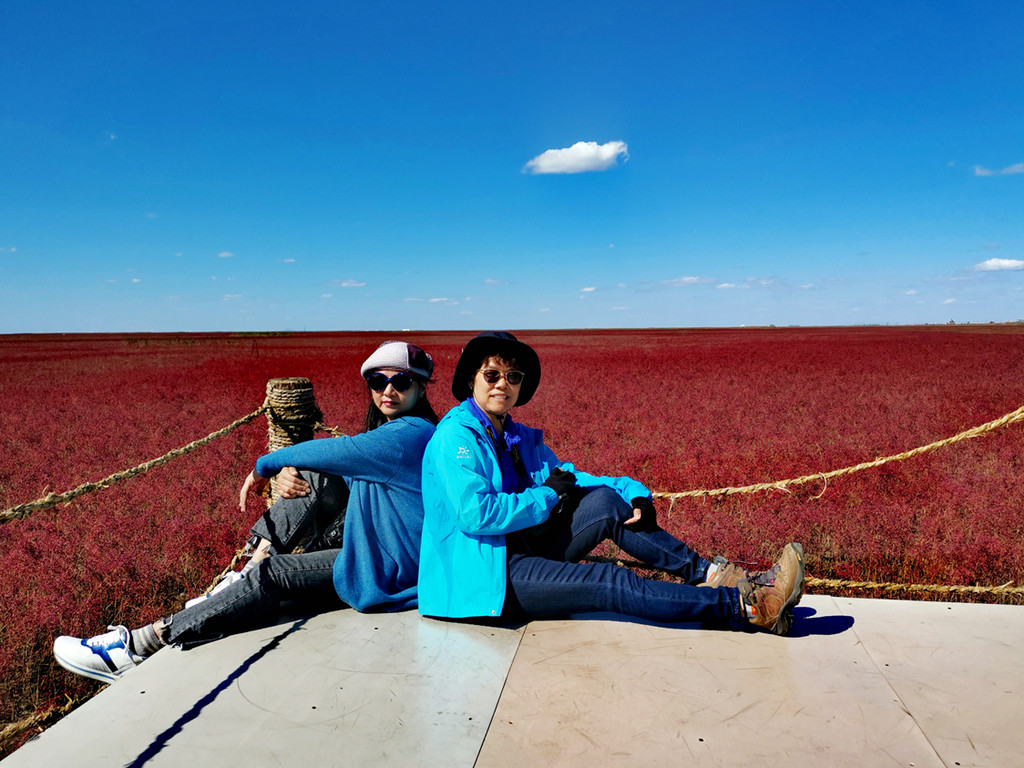 10月1日正好是八月十五,涨潮的海水淹没了红海滩,啥也看不到。我们来的正是时候,满眼望去,红彤彤的一片。