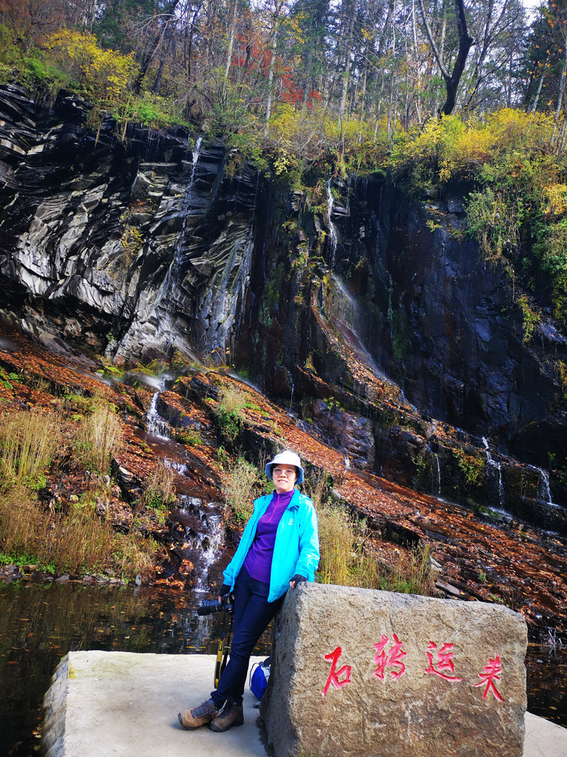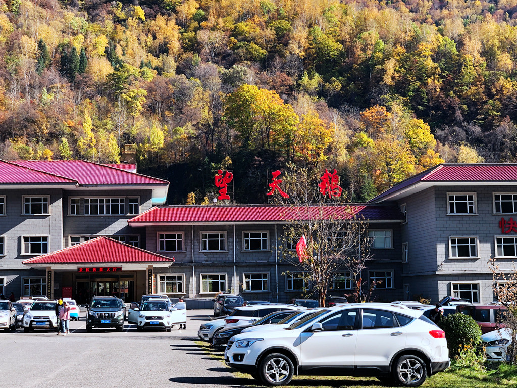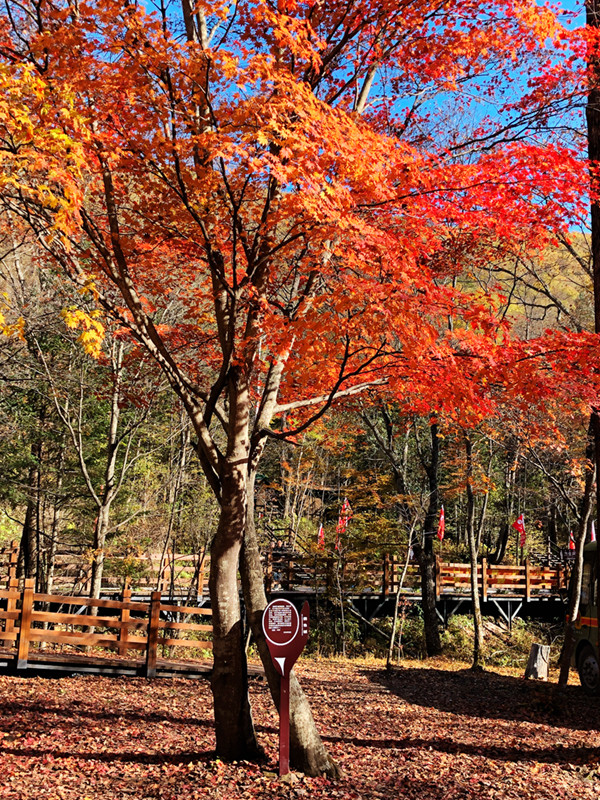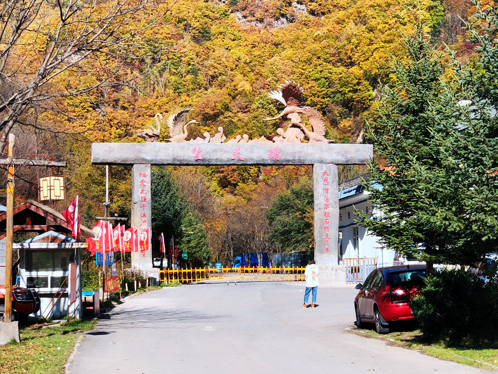 从住地到关门山公园路程不远,半个来小时左右就到了。停车场走到团队入口处步行1公里,排队买门票,进去后再排队等园内交通车,8:30算是真正走进了这座被誉为东北小黄山风景区。选择坐景区车坐到终点枫王站,听说枫王已经红了。