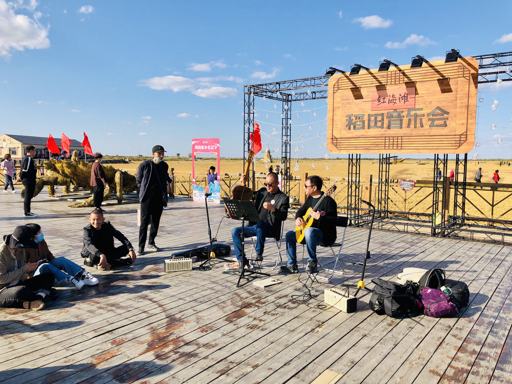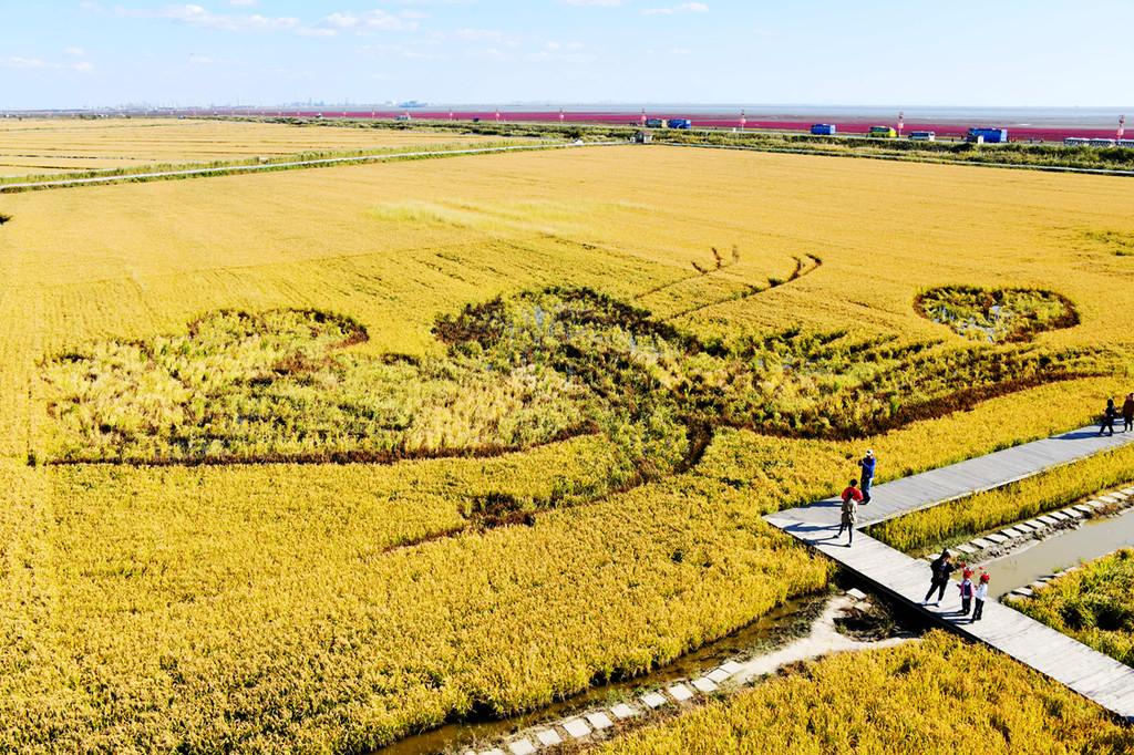 第三个点是一点二景,一红一黄。在红海滩对面,有一片金黄色的稻田,被称为“稻梦空间”。是以稻为画笔,田为画布,风奏乐,苍穹下,将艺术“种”到田间的艺术。