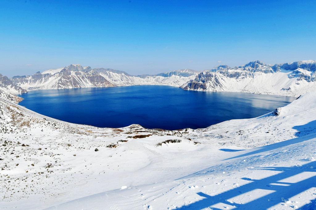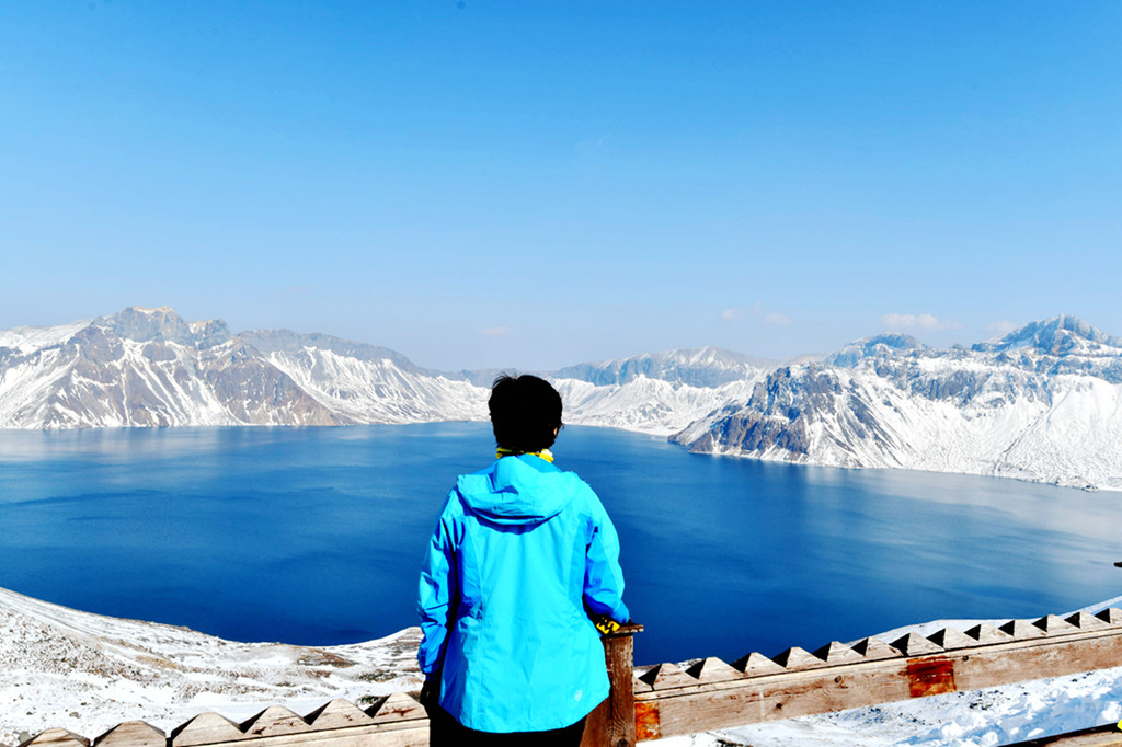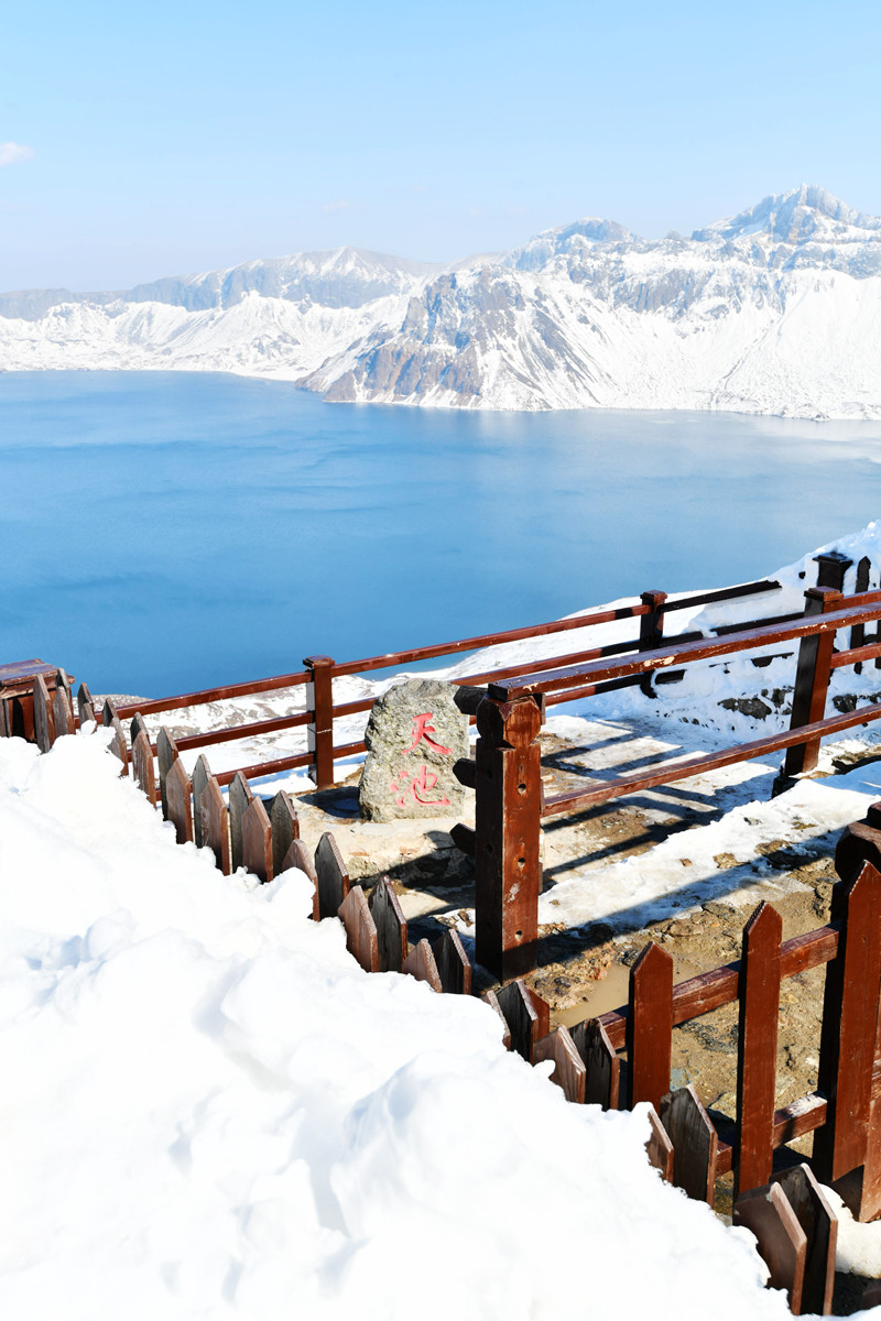 登到山顶,我的眼前豁然开朗,蓝天下的天池被白色雪山环绕着,池水碧蓝,如一颗巨大的蓝宝石跌入人间。难以形容心中的那份激动,什么能够比得上愿望的实现更令人开心快乐的呢?!