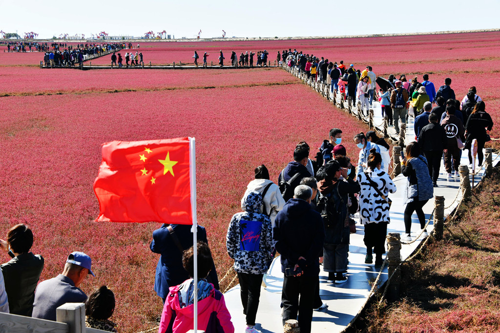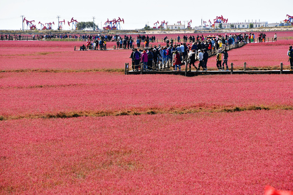 在距离沈阳市3个多小时车程的盘锦市,有一片被称为红海滩的风景区,那片鲜红如火的草原,一眼望不到边,在炽热的阳光下散发着火热的热情,欢迎来自四面八方的朋友。游人如织,但依然挡不住人们追求美景的热情。