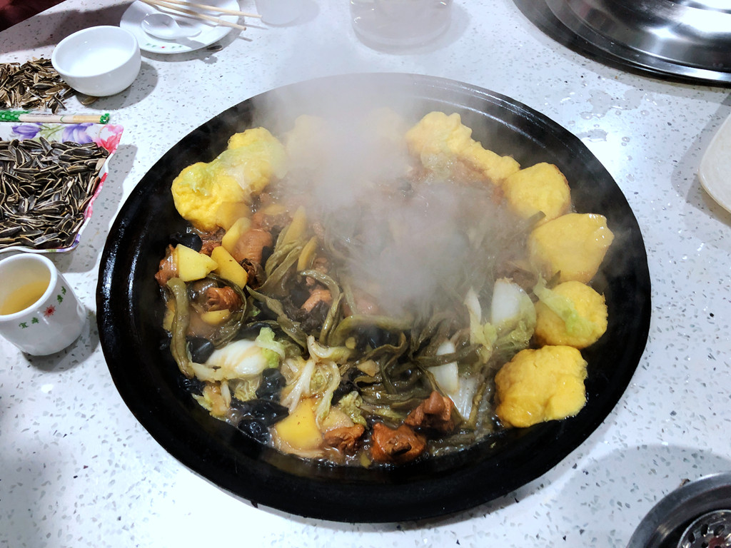 晚上8位团友再次结伴去吃东北名吃—一锅炖。一口大铁锅将鸡、干豆角、土豆、蘑菇、木耳、粉条等绘在一起,锅边贴上黄澄澄的玉米饼。当锅烧开后,香味扑鼻,惹得我们更饿了,十五分钟的等待就像等了一小时。当大铁锅盖掀起时,我们都禁不住哇哇叫了出来,太有诱惑力了!一大锅肉菜被我们吃得一干二净!