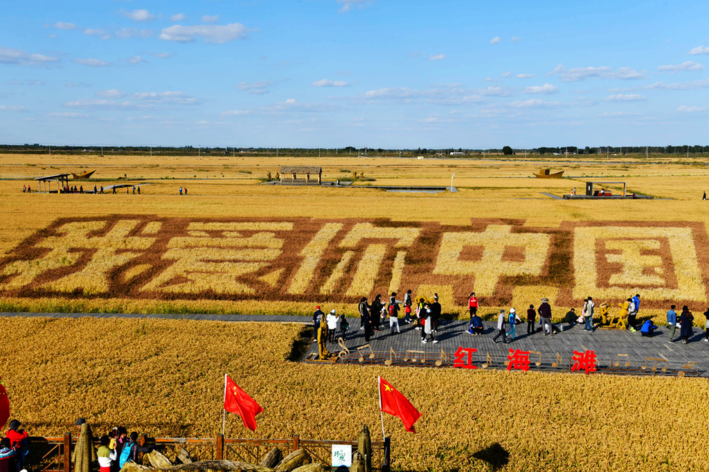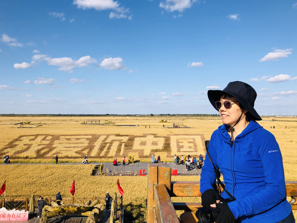 登上高处俯瞰稻田画,画面栩栩如生,有我爱你中国、稻鹤迎春、盘锦红海滩……,举目远眺,一步一景,美不胜收。稻田音乐会也正在举行。